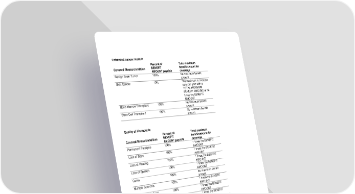 RL-CI4-CHR2-20-IN 3 CHR-12969 (11/25) Quality of life module Covered illness/condition Percent of BENEFIT AMOUNT payable Total maximum benefit amount for coverage Permanent Paralysis 100% 1 times the BENEFIT AMOUNT Loss of Sight 100% 1 times the BENEFIT AMOUNT Loss of Hearing 100% 1 times the BENEFIT AMOUNT Loss of Speech 100% 1 times the BENEFIT AMOUNT Coma 100% No maximum benefit amount Multiple Sclerosis 100% 1 times the BENEFIT AMOUNT Amyotrophic Lateral Sclerosis (ALS) 100% 1 times the BENEFIT AMOUNT Parkinson’s Disease 100% 1 times the BENEFIT AMOUNT Advanced Dementia, including Alzheimer’s Disease 100% 1 times the BENEFIT AMOUNT Huntington’s Disease (Huntington’s Chorea) 100% 1 times the BENEFIT AMOUNT Muscular Dystrophy 100% 1 times the BENEFIT AMOUNT Infectious Disease 25% No maximum benefit amount Addison’s Disease 10% 1 times the BENEFIT AMOUNT Myasthenia Gravis 50% 1 times the BENEFIT AMOUNT Systemic Lupus Erythematosus (SLE) 50% 1 times the BENEFIT AMOUNT Enhanced cancer module Covered illness/condition Percent of BENEFIT AMOUNT payable Total maximum benefit amount for coverage Benign Brain Tumor 100% No maximum benefit amount Skin Cancer 10% The maximum is once per calendar year with a TOTAL MAXIMUM BENEFIT AMOUNT of 10 times the BENEFIT AMOUNT Bone Marrow Transplant 100% No maximum benefit amount Stem Cell Transplant 100% No maximum benefit amount