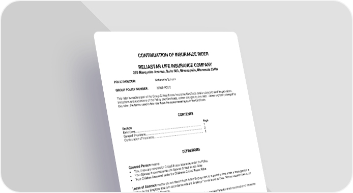 RL-CI4-CNT2-20 1 CNT-12969 (11/25) DEFINITIONS Covered Person means: You, if you are covered for Critical Illness insurance under the Policy. Your Spouse if covered under the Spouse Critical Illness Rider. Your Children if covered under the Children’s Critical Illness Rider. Leave of Absence means you are absent from Active Employment for a period of time under a leave granted in Writing by the Employer that is in accordance with the Employer' formal leave policies. Normal vacation time is not considered a Leave of Absence. Labor Strike means you are absent from Active Employment for a period of time for which continuation of insurance is available under the Employer's Written plan for labor strikes. Temporary Layoff means you are absent from Active Employment and no longer an Employee of the Employer for a limited period of time, and the layoff is not intended to be permanent. Total Disability or Totally Disabled means that due to an injury or sickness you are unable to perform the material duties of your regular occupation, and you are unable to perform any other occupation for which you are fit by education, training or experience. CONTINUATION OF INSURANCE RIDER RELIASTAR LIFE INSURANCE COMPANY 250 Marquette Avenue, Suite 900, Minneapolis, Minnesota 55401 POLICYHOLDER: Noblesville Schools GROUP POLICY NUMBER: 73058-1CCI2 This rider is made a part of the Group Critical Illness Insurance Certificate and is subject to all of the provisions, limitations and exclusions of the Policy and Certificate, unless changed by this rider. Unless expressly changed by this rider, the terms used in this rider have the same meaning as in the Certificate. CONTENTS Section Page Definitions.................................................................................................. 1 General Provisions..................................................................................... 2 Continuation of Insurance........................................................................... 2