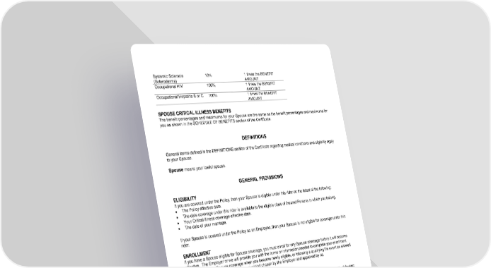 RL-CI4-SPR2-20-IN 4 SPR-12969 (11/25) Systemic Sclerosis (Scleroderma) 10% 1 times the BENEFIT AMOUNT Occupational HIV 100% 1 times the BENEFIT AMOUNT Occupational Hepatitis B or C 100% 1 times the BENEFIT AMOUNT SPOUSE CRITICAL ILLNESS BENEFITS The benefit percentages and maximums for your Spouse are the same as the benefit percentages and maximums for you as shown in the SCHEDULE OF BENEFITS section of the Certificate. GENERAL PROVISIONS ELIGIBILITY If you are covered under the Policy, then your Spouse is eligible under this rider on the latest of the following: The Policy effective date. The date coverage under this rider is available to the eligible class of Insured Persons to which you belong. Your Critical Illness coverage effective date. The date of your marriage. If your Spouse is covered under the Policy as an Employee, then your Spouse is not eligible for coverage under this rider. ENROLLMENT If you have a Spouse eligible for Spouse coverage, you must enroll for any Spouse coverage before it will become effective. The Employer or we will provide you with the forms or information needed to complete your enrollment. You may enroll for Spouse coverage when you become newly eligible, or following a qualifying life event as allowed by the Employer, or during an enrollment period chosen by the Employer and approved by us. EFFECTIVE DATE OF COVERAGE Your Spouse will be covered at 12:01 a.m. standard time at the Policyholder’s address on the latest of the following: The date your Spouse is eligible for coverage, if you enroll for Spouse coverage on or before that date. The first day of the month that is on or next follows the date you enroll for Spouse coverage. The first day of the month that is on or next follows the date you return to Active Employment, if you are not in Active Employment when your Spouse’s coverage would otherwise become effective. Exception: Coverage starts on a non-working day if you were in Active Employment on your last scheduled working day before the non- working day. Non-working days include time off for the following: vacations, personal holidays, weekends and holidays, approved non-medical leave of absence and paid time off for non-medical-related absences. EFFECTIVE DATE OF CHANGES TO COVERAGE Once your Spouse’s coverage begins, any increased or additional coverage will take effect on the latest of the following: The date of the increased or additional coverage, if you are in Active Employment. The date you return to Active Employment, if you are not in Active Employment due to injury or sickness. DEFINITIONS General terms defined in the DEFINITIONS section of the Certificate regarding medical conditions and eligibility apply to your Spouse. Spouse means your lawful spouse.