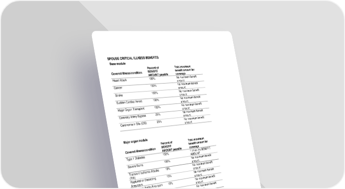 RL-CI4-SPR2-20-IN 2 SPR-12969 (11/25) SPOUSE CRITICAL ILLNESS BENEFITS Base module Covered illness/condition Percent of BENEFIT AMOUNT payable Total maximum benefit amount for coverage Heart Attack 100% No maximum benefit amount Cancer 100% No maximum benefit amount Stroke 100% No maximum benefit amount Sudden Cardiac Arrest 100% No maximum benefit amount Major Organ Transplant 100% No maximum benefit amount Coronary Artery Bypass 25% No maximum benefit amount Carcinoma in Situ (CIS) 25% No maximum benefit amount Major organ module Covered illness/condition Percent of BENEFIT AMOUNT payable Total maximum benefit amount for coverage Type 1 Diabetes 100% 1 times the BENEFIT AMOUNT Severe Burns 100% No maximum benefit amount Transient Ischemic Attacks (TIA) 10% No maximum benefit amount Ruptured or Dissecting Aneurysm 10% No maximum benefit amount Abdominal Aortic Aneurysm 10% No maximum benefit amount Thoracic Aortic Aneurysm 10% No maximum benefit amount Open Heart Surgery for Valve Replacement or Repair 25% No maximum benefit amount Transcatheter Heart Valve Replacement or Repair 10% No maximum benefit amount Coronary Angioplasty 10% No maximum benefit amount Implantable (or Internal) Cardioverter Defibrillator (ICD) Placement 25% No maximum benefit amount Pacemaker Placement 10% No maximum benefit amount