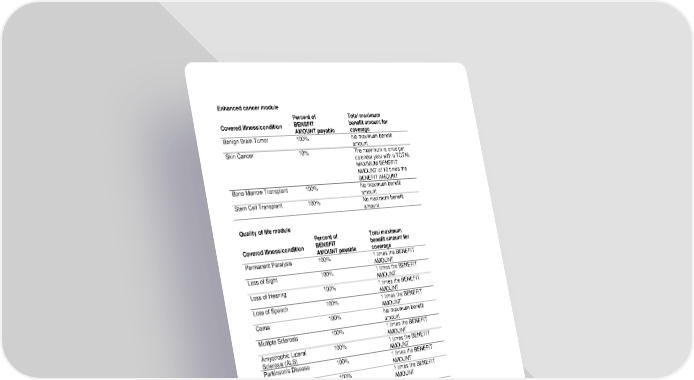 RL-CI4-CERT2-20-IN 5 D12969 (11/25) Enhanced cancer module Covered illness/condition Percent of BENEFIT AMOUNT payable Total maximum benefit amount for coverage Benign Brain Tumor 100% No maximum benefit amount Skin Cancer 10% The maximum is once per calendar year with a TOTAL MAXIMUM BENEFIT AMOUNT of 10 times the BENEFIT AMOUNT Bone Marrow Transplant 100% No maximum benefit amount Stem Cell Transplant 100% No maximum benefit amount Quality of life module Covered illness/condition Percent of BENEFIT AMOUNT payable Total maximum benefit amount for coverage Permanent Paralysis 100% 1 times the BENEFIT AMOUNT Loss of Sight 100% 1 times the BENEFIT AMOUNT Loss of Hearing 100% 1 times the BENEFIT AMOUNT Loss of Speech 100% 1 times the BENEFIT AMOUNT Coma 100% No maximum benefit amount Multiple Sclerosis 100% 1 times the BENEFIT AMOUNT Amyotrophic Lateral Sclerosis (ALS) 100% 1 times the BENEFIT AMOUNT Parkinson’s Disease 100% 1 times the BENEFIT AMOUNT Advanced Dementia, including Alzheimer’s Disease 100% 1 times the BENEFIT AMOUNT Huntington’s Disease (Huntington’s Chorea) 100% 1 times the BENEFIT AMOUNT Muscular Dystrophy 100% 1 times the BENEFIT AMOUNT Infectious Disease 25% No maximum benefit amount Addison’s Disease 10% 1 times the BENEFIT AMOUNT Myasthenia Gravis 50% 1 times the BENEFIT AMOUNT Systemic Lupus Erythematosus (SLE) 50% 1 times the BENEFIT AMOUNT Systemic Sclerosis (Scleroderma) 10% 1 times the BENEFIT AMOUNT Occupational HIV 100% 1 times the BENEFIT AMOUNT Occupational Hepatitis B or C 100% 1 times the BENEFIT AMOUNT