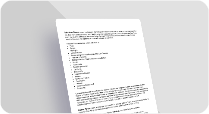 RL-CI4-CERT2-20-IN 10 D12969 (11/25) Infectious Disease means the diagnosis of an infectious disease that results in you being confined to a Hospital for five (5) or more consecutive days or confined to a transitional care facility for five (5) or more consecutive days. In the event you die while confined as the result of being diagnosed with an infectious disease, we will consider this time period to have been met regardless of the actual number of days confined. Infectious Diseases include, but are not limited to: Polio; Rabies; Meningitis; Lyme’s Disease; Bovine spongiform encephalopathy (Mad Cow Disease); Flesh eating bacteria; Methicillin-resistant Staphylococcus aureus (MRSA); Sepsis; Tuberculosis; Bacterial pneumonia; Diphtheria; Encephalitis. Legionnaire’s Disease; Malaria; Necrotizing Fasciitis; Osteomyelitis; Tetanus; Ebola Virus Disease; and Coronavirus. “Confined/confinement” means that on the advice of a Doctor, your assignment to a bed as a resident inpatient in a Hospital or transitional care facility. There must be a charge for room and board, other than in any government, military or veterans’ facility for which there is no charge for room and board. “Transitional care facility” means a facility which provides a bridge between the Hospital and home for restorative and rehabilitation care. It must provide skilled nursing care and must be either located in a community nursing home or a Hospital. Confined/confinement also includes assignment to an observation unit in a Hospital, if you stay for at least 20 consecutive hours. Insured Person means an Employee who is eligible for coverage under the Policy, becomes covered according to the terms of the Policy, and whose coverage remains in effect according to the terms of the Policy. Loss of Hearing means the diagnosis of profound deafness in both ears that is not correctable. Loss of Sight means the diagnosis of clinically proven irreversible reduction of sight in both eyes with: Sight in the better eye reduced to a best corrected visual acuity of less than 6/60 (metric acuity) or 20/200 (Snellen or E-Chart Acuity); or Visual field restriction to 20 degrees or less in both eyes. Loss of Speech means the clinical diagnosis of total and permanent loss of the ability to speak. Major Organ Transplant means the irreversible failure of your heart, lung, pancreas, an entire kidney or the entire liver, or any combination of these conditions, as determined by a Doctor specialized in care of the involved organ. Acceptance to the UNOS (United Network for Organ Sharing) list is required for this determination, except for kidney failure. If you receive the transplant prior to placement on the network, the network requirement will be waived. If your Doctor determines you are not healthy enough to be placed on the UNOS list or you are rejected from the list, the network requirement will be waived. “Kidney failure” means chronic, irreversible failure of one or both kidneys for which a Doctor recommends either of the following: Regular hemodialysis or peritoneal dialysis (at least weekly) in order to sustain life, which is expected to continue for at least 6 months. Renal transplantation.