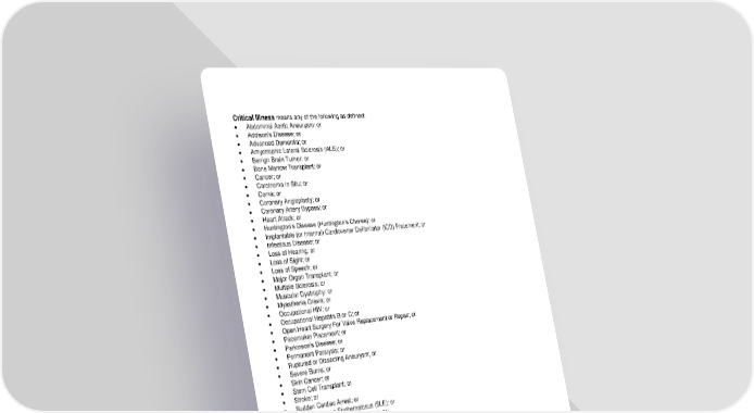 RL-CI4-CERT2-20-IN 8 D12969 (11/25) Critical Illness means any of the following as defined: Abdominal Aortic Aneurysm; or Addison’s Disease; or Advanced Dementia; or Amyotrophic Lateral Sclerosis (ALS); or Benign Brain Tumor; or Bone Marrow Transplant; or Cancer; or Carcinoma in Situ; or Coma; or Coronary Angioplasty; or Coronary Artery Bypass; or Heart Attack; or Huntington’s Disease (Huntington’s Chorea); or Implantable (or Internal) Cardioverter Defibrillator (ICD) Placement; or Infectious Disease; or Loss of Hearing; or Loss of Sight; or Loss of Speech; or Major Organ Transplant; or Multiple Sclerosis; or Muscular Dystrophy; or Myasthenia Gravis; or Occupational HIV; or Occupational Hepatitis B or C; or Open Heart Surgery For Valve Replacement or Repair; or Pacemaker Placement; or Parkinson’s Disease; or Permanent Paralysis; or Ruptured or Dissecting Aneurysm; or Severe Burns; or Skin Cancer; or Stem Cell Transplant; or Stroke; or Sudden Cardiac Arrest; or Systemic Lupus Erythematosus (SLE); or Systemic Sclerosis (Scleroderma); or Thoracic Aortic Aneurysm; or Transcatheter Heart Valve Replacement or Repair; or Transient Ischemic Attacks (TIA); or Type 1 Diabetes. Different Diagnosis means any of the following: A diagnosis of a Critical Illness that is for a different illness/condition than a previously diagnosed illness/condition. A diagnosis that is related to an illness/condition that existed prior to your coverage effective date if: - The subsequent diagnosis of the Critical Illness is for the same illness/condition as an illness/condition diagnosed prior to your coverage effective date under the Policy. A diagnosis that is related to a Critical Illness for which we previously paid benefits if: - The subsequent diagnosis of the Critical Illness, other than Cancer or Carcinoma in Situ or Skin Cancer, is for the same illness/condition as a Critical Illness for which benefits were payable under the Policy. - The subsequent diagnosis of Cancer or Carcinoma in Situ or Skin Cancer 1) is for the same illness/condition as a Critical Illness for which benefits were payable under the Policy, and 2) occurs more than 3 months after the date of the previous diagnosis. Note: A second or confirmatory medical opinion is not a Different Diagnosis.
