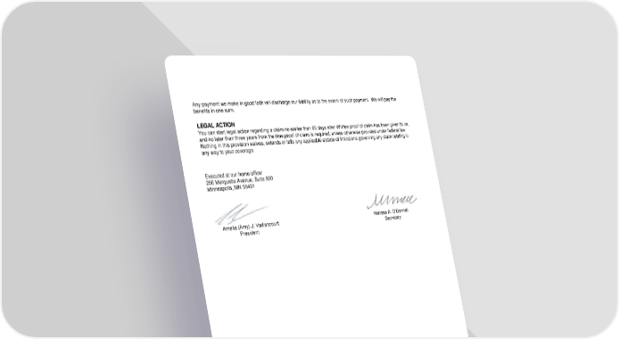 RL-CI4-WELL2-20-IN 4 WELL-12969 (11/25) Any payment we make in good faith will discharge our liability as to the extent of such payment. We will pay the benefits in one sum. Executed at our home office: 250 Marquette Avenue, Suite 900 Minneapolis, MN 55401 Amelia (Amy) J. Vaillancourt Melissa A. O'Donnell President Secretary LEGAL ACTION You can start legal action regarding a claim no earlier than 60 days after Written proof of claim has been given to us, and no later than three years from the time proof of claim is required, unless otherwise provided under federal law. Nothing in this provision waives, extends or tolls any applicable statute of limitations governing any claim relating in any way to your coverage.