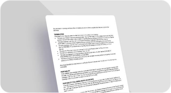 RL-CI4-SPR2-20-IN 5 SPR-12969 (11/25) Any decrease in coverage will take effect immediately but will not affect a payable claim that occurs prior to the decrease. TERMINATION Coverage for your Spouse under this rider terminates on the earliest of the following: The date your Critical Illness insurance terminates. See the PORTABILITY FOLLOWING DEATH OR DIVORCE provision below if termination is due to death or regarding Spouse coverage previously continued by your Spouse. The date coverage under this rider is terminated for all Active Employees under the Policy. See the PORTABILITY provisions below regarding Spouse coverage previously continued by you or your Spouse. The date coverage under this rider is terminated for the eligible class of Active Employees to which you belong. See the PORTABILITY provisions below regarding Spouse coverage previously continued by you or your Spouse. The date the Policy terminates and coverage for all Insured Persons under the Policy terminates. The date you voluntarily cancel coverage under this rider. The date your Spouse is no longer an eligible Spouse as defined by this rider. See the PORTABILITY FOLLOWING DEATH OR DIVORCE provision below. The end of the period for which premiums for this rider are paid, if the next premium is not paid by its due date, subject to the GRACE PERIOD provision. We will pay benefits for a loss that occurs while your Spouse is insured under this rider even if the rider has since terminated. PORTABILITY If you continue your coverage under the Certificate’s PORTABILITY provision, then your Spouse’s coverage under this rider may also be continued at the same time. Continued premium payment is required to keep your Spouse’s coverage under this rider in force. You may not increase the continued Spouse coverage amount. Continued Spouse coverage under this provision is subject to all the terms of this rider. PORTABILITY FOLLOWING DEATH OR DIVORCE If you die or divorce, your Spouse may elect to continue Spouse coverage under this rider if certain conditions are met. Your Spouse must have been insured under this rider on the date of your death or divorce, your Spouse must be under age 75 and your Spouse must elect portability and pay the first premium within 31 days of the date of your death or divorce. If your Spouse continues coverage under this provision, your Spouse will become the owner of their Spouse coverage under this rider. Your Spouse may decrease the continued Spouse coverage amount based on the amounts available on this rider’s SCHEDULE OF BENEFITS. Your Spouse may not increase the continued Spouse coverage amount. Coverage continued under this provision is subject to all the terms of this rider. Premiums will be billed directly to your Spouse. Continued premium payment is required to keep coverage in force. The initial premium will be based on the portability premium rates in effect at the time your Spouse elects portability. We may change the portability premium rates at any time upon 60 days Written notice to your Spouse. Coverage continued under this provision will end on the earliest of the following: The end of the period for which premiums for this rider are paid if the next premium is not paid by its due date, subject to the GRACE PERIOD provision. The date your Spouse voluntarily cancels coverage under this rider. The date your Spouse dies. The date the Policy terminates and coverage for all Insured Persons under the Policy terminates, upon 60 days Written notice of termination.