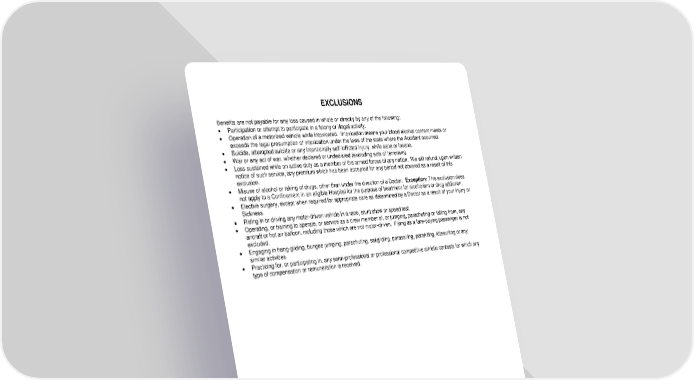 RL-HI2-CERT-20-IN 12 D12970 (11/25) EXCLUSIONS Benefits are not payable for any loss caused in whole or directly by any of the following: Participation or attempt to participate in a felony or illegal activity. Operation of a motorized vehicle while intoxicated. Intoxication means your blood alcohol content meets or exceeds the legal presumption of intoxication under the laws of the state where the Accident occurred. Suicide, attempted suicide or any intentionally self-inflicted Injury, while sane or insane. War or any act of war, whether declared or undeclared (excluding acts of terrorism). Loss sustained while on active duty as a member of the armed forces of any nation. We will refund, upon written notice of such service, any premium which has been accepted for any period not covered as a result of this exclusion. Misuse of alcohol or taking of drugs, other than under the direction of a Doctor. Exception: This exclusion does not apply to a Confinement in an eligible Hospital for the purpose of treatment for alcoholism or drug addiction. Elective surgery, except when required for appropriate care as determined by a Doctor as a result of your Injury or Sickness. Riding in or driving any motor-driven vehicle in a race, stunt show or speed test. Operating, or training to operate, or service as a crew member of, or jumping, parachuting or falling from, any aircraft or hot air balloon, including those which are not motor-driven. Flying as a fare-paying passenger is not excluded. Engaging in hang-gliding, bungee jumping, parachuting, sailgliding, parasailing, parakiting, kitesurfing or any similar activities. Practicing for, or participating in, any semi-professional or professional competitive athletic contests for which any type of compensation or remuneration is received.