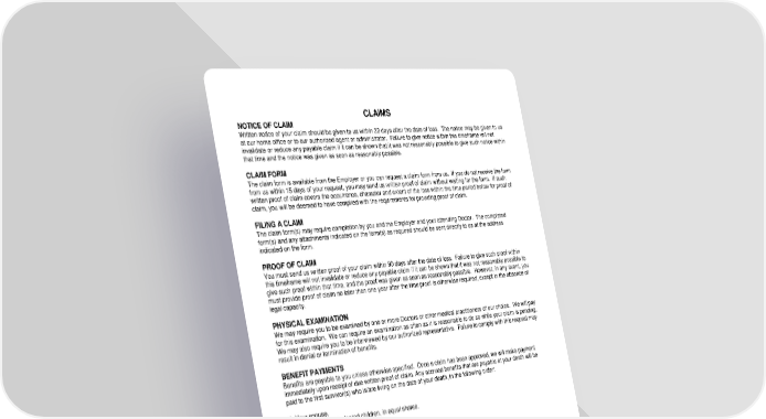 RL-HI2-CERT-20-IN 13 D12970 (11/25) CLAIMS NOTICE OF CLAIM Written notice of your claim should be given to us within 30 days after the date of loss. The notice may be given to us at our home office or to our authorized agent or administrator. Failure to give notice within this timeframe will not invalidate or reduce any payable claim if it can be shown that it was not reasonably possible to give such notice within that time and the notice was given as soon as reasonably possible. CLAIM FORM The claim form is available from the Employer or you can request a claim form from us. If you do not receive the form from us within 15 days of your request, you may send us written proof of claim without waiting for the form. If such written proof of claim covers the occurrence, character and extent of the loss within the time period below for proof of claim, you will be deemed to have complied with the requirements for providing proof of claim. FILING A CLAIM The claim form(s) may require completion by you and the Employer and your attending Doctor. The completed form(s) and any attachments indicated on the form(s) as required should be sent directly to us at the address indicated on the form. PROOF OF CLAIM You must send us written proof of your claim within 90 days after the date of loss. Failure to give such proof within this timeframe will not invalidate or reduce any payable claim if it can be shown that it was not reasonably possible to give such proof within that time, and the proof was given as soon as reasonably possible. However, in any event, you must provide proof of claim no later than one year after the time proof is otherwise required, except in the absence of legal capacity. PHYSICAL EXAMINATION We may require you to be examined by one or more Doctors or other medical practitioners of our choice. We will pay for this examination. We can require an examination as often as it is reasonable to do so while your claim is pending. We may also require you to be interviewed by our authorized representative. Failure to comply with this request may result in denial or termination of benefits. BENEFIT PAYMENTS Benefits are payable to you unless otherwise specified. Once a claim has been approved, we will make payment immediately upon receipt of due written proof of claim. Any accrued benefits that are payable at your death will be paid to the first survivor(s) who is/are living on the date of your death, in the following order: 1. Your spouse. 2. Your natural and adopted children, in equal shares. 3. Your grandchildren, in equal shares. 4. Your parents, in equal shares. 5. Your siblings, in equal shares. 6. Your estate. If a survivor entitled to receive a payment dies before receiving it, we will make payment to that person’s estate. If a survivor entitled to receive a payment has a special needs trust established, we will make payment to that person’s trust instead of to the person directly. “Spouse” in this provision means your lawful spouse. Any payment we make in good faith will discharge our liability as to the extent of such payment. We will pay the benefits in one sum or in a method comparable to one sum. LEGAL ACTION You can start legal action regarding a claim no earlier than 60 days after written proof of claim has been given to us, and no later than three years from the time proof of claim is required, unless otherwise provided under federal law. Nothing in this provision waives, extends or tolls any applicable statute of limitations governing any claim relating in any way to your coverage.