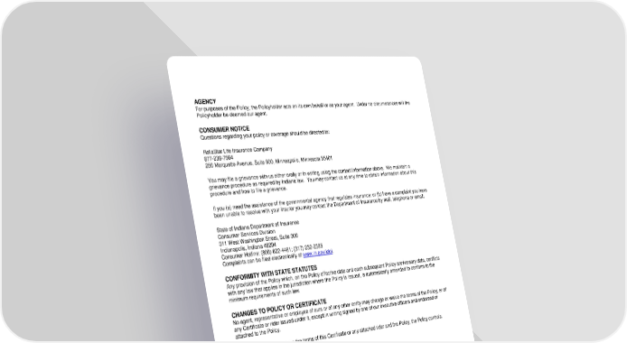 RL-HI2-CERT-20-IN 10 D12970 (11/25) AGENCY For purposes of the Policy, the Policyholder acts on its own behalf or as your agent. Under no circumstances will the Policyholder be deemed our agent. CONSUMER NOTICE Questions regarding your policy or coverage should be directed to: ReliaStar Life Insurance Company 877-236-7564 250 Marquette Avenue, Suite 900, Minneapolis, Minnesota 55401 You may file a grievance with us either orally or in writing using the contact information above. We maintain a grievance procedure as required by Indiana law. You may contact us at any time to obtain information about this procedure and how to file a grievance. If you (a) need the assistance of the governmental agency that regulates insurance; or (b) have a complaint you have been unable to resolve with your insurer you may contact the Department of Insurance by mail, telephone or email: State of Indiana Department of Insurance Consumer Services Division 311 West Washington Street, Suite 300 Indianapolis, Indiana 46204 Consumer Hotline: (800) 622-4461; (317) 232-2395 Complaints can be filed electronically at www.in.gov/idoi. CONFORMITY WITH STATE STATUTES Any provision of the Policy which, on the Policy effective date and each subsequent Policy anniversary date, conflicts with any law that applies in the jurisdiction where the Policy is issued, is automatically amended to conform to the minimum requirements of such law. CHANGES TO POLICY OR CERTIFICATE No agent, representative or employee of ours or of any other entity may change or waive the terms of the Policy, or of any Certificate or rider issued under it, except in writing signed by one of our executive officers and endorsed or attached to the Policy. If there is a conflict between the terms of this Certificate or any attached rider and the Policy, the Policy controls.