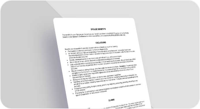 RL-HI2-SPR-18-IN 3 SPR-12970 (11/25) SPOUSE BENEFITS The benefits for your Spouse are the same as your benefits as shown in the BENEFITS section of the Certificate, based on your Spouse’s Confinement or other covered loss, and subject to the EXCLUSIONS of this rider. EXCLUSIONS Benefits are not payable for any loss caused in whole or directly by any of the following: Participation or attempt to participate in a felony or illegal activity. An Accident while your Spouse is operating a motorized vehicle while intoxicated. Intoxication means your Spouse’s blood alcohol content meets or exceeds the legal presumption of intoxication under the laws of the state where the Accident occurred. Suicide, attempted suicide or any intentionally self-inflicted Injury, while sane or insane. War or any act of war, whether declared or undeclared (excluding acts of terrorism). Loss sustained while on active duty as a member of the armed forces of any nation. We will refund, upon written notice of such service, any premium which has been accepted for any period not covered as a result of this exclusion. Misuse of alcohol or taking of drugs, other than under the direction of a Doctor. Exception: This exclusion does not apply to a Confinement in an eligible Hospital for the purpose of treatment for alcoholism or drug addiction. Elective surgery, except when required for appropriate care as determined by a Doctor as a result of your Spouse’s Injury or Sickness. Riding in or driving any motor-driven vehicle in a race, stunt show or speed test. Operating, or training to operate, or service as a crew member of, or jumping, parachuting or falling from, any aircraft or hot air balloon, including those which are not motor-driven. Flying as a fare-paying passenger is not excluded. Engaging in hang-gliding, bungee jumping, parachuting, sailgliding, parasailing, parakiting, kitesurfing or any similar activities. Practicing for, or participating in, any semi-professional or professional competitive athletic contests for which any type of compensation or remuneration is received. CLAIMS NOTICE OF CLAIM Written notice of your claim should be given to us within 30 days after the date of loss. The notice may be given to us at our home office or to our authorized agent or administrator. Failure to give notice within this timeframe will not invalidate or reduce any payable claim if it can be shown that it was not reasonably possible to give such notice within that time and the notice was given as soon as reasonably possible. CLAIM FORM The claim form is available from the Employer or you can request a claim form from us. If you do not receive the form from us within 15 days of your request, you may send us written proof of claim without waiting for the form. If such written proof of claim covers the occurrence, character and extent of the loss within the time period below for proof of claim, you will be deemed to have complied with the requirements for providing proof of claim. FILING A CLAIM The claim form(s) may require completion by you and the Employer and your Spouse’s attending Doctor. The completed form(s) and any attachments indicated on the form(s) as required should be sent directly to us at the address indicated on the form.