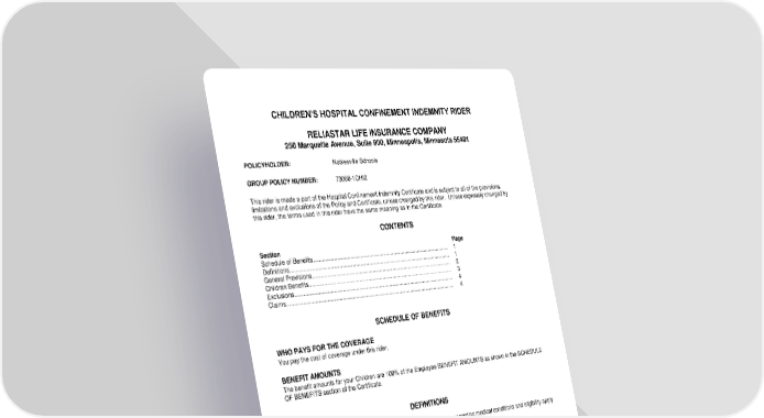 RL-HI2-CHR-18-IN 1 CHR-12970 (11/25) CHILDREN’S HOSPITAL CONFINEMENT INDEMNITY RIDER RELIASTAR LIFE INSURANCE COMPANY 250 Marquette Avenue, Suite 900, Minneapolis, Minnesota 55401 POLICYHOLDER: Noblesville Schools GROUP POLICY NUMBER: 73058-1CHI2 This rider is made a part of the Hospital Confinement Indemnity Certificate and is subject to all of the provisions, limitations and exclusions of the Policy and Certificate, unless changed by this rider. Unless expressly changed by this rider, the terms used in this rider have the same meaning as in the Certificate. CONTENTS Section Page Schedule of Benefits............................................................................................... 1 Definitions............................................................................................................... 1 General Provisions................................................................................................. 2 Children Benefits.................................................................................................... 3 Exclusions.............................................................................................................. 4 Claims.................................................................................................................... 4 SCHEDULE OF BENEFITS WHO PAYS FOR THE COVERAGE You pay the cost of coverage under this rider. BENEFIT AMOUNTS The benefit amounts for your Children are 100% of the Employee BENEFIT AMOUNTS as shown in the SCHEDULE OF BENEFITS section of the Certificate. DEFINITIONS General terms defined in the DEFINITIONS section of the Certificate regarding medical conditions and eligibility apply to your Children. Child or Children means a child from birth but less than 26 years of age who is one of the following: Your natural child. Your adopted child as of the earlier of the date of placement for the purpose of adoption or the date of entry of an order granting you custody of the child for purposes of adoption. Your stepchild. A child or grandchild for whom you are a legal guardian. Your foster child. The child must also meet all of the following conditions: Not be on full-time active duty in the armed forces of any country or subdivision thereof. Legally reside in the United States or its territories or possessions. Not be insured under the Policy as an Employee or Spouse.