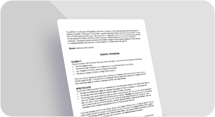 RL-HI2-CHR-18-IN 2 CHR-12970 (11/25) This definition includes your Child age 26 or older who is incapable of self-sustaining employment due to physical or intellectual disability. Written proof of the Child's incapacity must be furnished to us at our home office within 31 days after the Child reaches the limiting age. We may require, at reasonable intervals, but not more than once a year after the two year period following attainment of the limiting age, evidence satisfactory to us that the incapacity is continuing. Coverage will continue while the Child remains incapable of self-sustaining employment due to physical or intellectual disability and continues to meet the definition of Child except for the age limit. Spouse means your lawful spouse. GENERAL PROVISIONS ELIGIBILITY If you are covered under the Policy, then your Children are eligible under this rider on the latest of the following: The Policy effective date. The date this rider is available to the eligible class of Insured Persons to which you belong. Your Hospital Confinement Indemnity coverage effective date. The date you acquire a Child by marriage, birth or adoption. If both you and your Spouse are covered under the Policy as an Employee, then only one of you may cover your Children under this rider. If the parent who is covering the Children stops being insured as an Employee then the other parent may apply for Children’s coverage under this rider within 60 days. EFFECTIVE DATE Your Children will be covered at 12:01 a.m. standard time at the Policyholder’s address on the latest of the following: The date your Children are eligible for coverage, if you apply for Children’s coverage on or before that date. The first day of the month following the date you apply for Children’s coverage. The first day of the month following the date you return to Active Employment, if you are not in Active Employment when your Children’s coverage would otherwise become effective. Exception: Coverage starts on a non-working day if you were in Active Employment on your last scheduled working day before the non-working day. Non- working days include time off for the following: vacations, personal holidays, weekends and holidays, approved nonmedical Leave of Absence and paid time off for nonmedical-related absences. If you have coverage under this rider and you acquire a new eligible Child due to birth, marriage or adoption, then the newly eligible Child will be covered automatically from the date of the event. If an adopted newborn Child is placed with you within 30 days of birth, the “event” will be the date of birth. If an adopted Child is placed with you more than 30 days after birth, the “event” will be the date of placement. No additional premium is required. EFFECTIVE DATE OF CHANGES TO COVERAGE Once your Children’s coverage begins, any increased or additional coverage due to an increase in the Employee coverage amount will take effect on the same date as the Employee coverage increase. Any decrease in coverage due to a decrease in the Employee coverage amount will take effect on the same date as the Employee coverage decrease, but will not affect a payable claim that occurs prior to the decrease. TERMINATION Coverage for each Child ends on the earliest of the following: The date this rider terminates. The date the Child is no longer an eligible Child as defined by this rider. Eligibility of a Child who is incapable of self-sustaining employment due to physical or intellectual disability ends when there is no longer evidence satisfactory to us that the incapacity is continuing. This rider terminates on the earliest of the following: The date your Certificate terminates. The date this rider is terminated for all Insured Persons under the Policy.