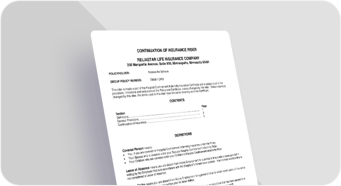 RL-HI2-CNT-18 1 CNT-12970 (11/25) CONTINUATION OF INSURANCE RIDER RELIASTAR LIFE INSURANCE COMPANY 250 Marquette Avenue, Suite 900, Minneapolis, Minnesota 55401 POLICYHOLDER: Noblesville Schools GROUP POLICY NUMBER: 73058-1CHI2 This rider is made a part of the Hospital Confinement Indemnity Insurance Certificate and is subject to all of the provisions, limitations and exclusions of the Policy and Certificate, unless changed by this rider. Unless expressly changed by this rider, the terms used in this rider have the same meaning as in the Certificate. CONTENTS Section Page Definitions............................................................................................................... 1 General Provisions................................................................................................. 2 Continuation of Insurance....................................................................................... 2 DEFINITIONS Covered Person means: You, if you are covered for Hospital Confinement Indemnity insurance under the Policy. Your Spouse who is covered under your Spouse Hospital Confinement Indemnity Rider. Your Children who are covered under your Children’s Hospital Confinement Indemnity Rider. Leave of Absence means you are absent from Active Employment for a period of time under a leave granted in writing by the Employer that is in accordance with the Employer’s formal leave policies. Your normal vacation time is not considered a Leave of Absence. Labor Strike means you are absent from Active Employment for a period of time for which continuation of insurance is available under the Employer’s written plan for labor strikes. Temporary Layoff means you are absent from Active Employment for a period of time that has been agreed to in advance in writing by the Employer. Your normal vacation time is not considered a Temporary Layoff.