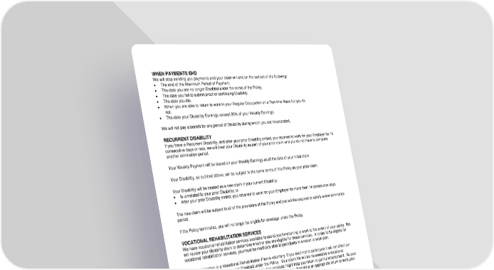 ICC19 RL-STD-CERT-19 17 D12972 (11/25) WHEN PAYMENTS END We will stop sending you payments and your claim will end on the earliest of the following: The end of the Maximum Period of Payment. The date you are no longer Disabled under the terms of the Policy. The date you fail to submit proof of continuing Disability. The date you die. When you are able to return to work in your Regular Occupation on a Part-time Basis but you do not. The date your Disability Earnings exceed 80% of your Weekly Earnings. We will not pay a benefit for any period of Disability during which you are incarcerated. RECURRENT DISABILITY If you have a Recurrent Disability, and after your prior Disability ended, you returned to work for your Employer for 14 consecutive days or less, we will treat your Disability as part of your prior claim and you do not have to complete another elimination period. Your Weekly Payment will be based on your Weekly Earnings as of the date of your initial claim. Your Disability, as outlined above, will be subject to the same terms of this Policy as your prior claim. Your Disability will be treated as a new claim if your current Disability: Is unrelated to your prior Disability; or After your prior Disability ended, you returned to work for your Employer for more than 14 consecutive days. The new claim will be subject to all of the provisions of the Policy and you will be required to satisfy a new elimination period. If the Policy terminates, you will no longer be eligible for coverage under the Policy. VOCATIONAL REHABILITATION SERVICES We have vocational rehabilitation services available to assist you in returning to work to the extent of your ability. We will review your disability claim to determine whether you are eligible for these services. In order to be eligible for vocational rehabilitation services, you must be medically able to participate in a return to work plan. Your participation in a Vocational Rehabilitation Plan is voluntary. If you elect not to participate it will not affect our determination of whether you are Disabled under the Policy. Your claim file will be reviewed by a vocational rehabilitation professional to determine if rehabilitation services might help you return to gainful employment. As your file is reviewed, medical and vocational information will be analyzed to determine an appropriate return to work plan. We will make the final determination of your eligibility for these services. If we determine that vocational rehabilitation services are appropriate, we will provide you with a Written Vocational Rehabilitation Plan developed specifically for you. The Vocational Rehabilitation Plan may include at our sole discretion, but is not limited to, the following services: Coordination with your Employer to assist you to return to work; Evaluation of adaptive equipment or job accommodations to allow you to work; Evaluation of possible workplace modifications which might allow you to return to work in your Regular Occupation or another job or occupation; Vocational evaluation to determine how your Disability may impact your employment options; Job placement services, including resume preparation services and training in job-seeking skills; alternative treatment plans such as recommendations for support groups, physical therapy, occupational therapy, or other treatment designed to enhance your ability to work.