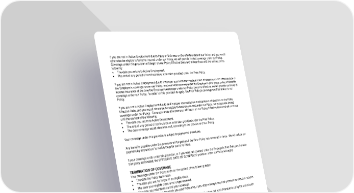 ICC19 RL-STD-CERT-19 10 D12972 (11/25) If you are not in Active Employment due to Injury or Sickness on the effective date of our Policy, and you would otherwise be eligible to become insured under our Policy, we will provide limited coverage under our Policy. Coverage under this provision will begin on our Policy Effective Date and will continue until the earliest of the following: The date you return to Active Employment. The end of any period of continuance or extension provided under the Prior Policy. If you are not in Active Employment due to Employer approved non-medical leave of absence on the effective date of the Employer’s coverage under our Policy, and you were covered under the Employer’s prior group policy of disability income insurance at the time the Employer's coverage under our Policy became effective, we will provide continuity of coverage under our Policy. In order for this provision to apply, the Prior Policy's coverage must be similar to our Policy. If you are not in Active Employment due to an Employer approved non-medical leave of absence on the Policy Effective Date, and you would otherwise be eligible to become insured under our Policy, we will provide limited coverage under our Policy. Coverage under this provision will begin on our Policy Effective Date and will continue until the earliest of the following: The date you return to Active Employment. The end of any period of continuance or extension provided under the Prior Policy. The date coverage would otherwise end, according to the provisions of our Policy. Your coverage under this provision is subject to payment of Premiums. Any benefits payable under this provision will be paid as if the Prior Policy had remained in force. We will reduce our payment by any amount for which the prior carrier is liable. If your coverage ends under this provision, or if you were not covered under the Employer's Prior Policy on the date that policy terminated, the EFFECTIVE DATE OF COVERAGE provision under our Policy will apply. TERMINATION OF COVERAGE Your coverage under the Policy ends on the earliest of the following dates: The date the Policy terminates. The date you are no longer in an eligible class. The date your eligible class is no longer covered. The date you voluntarily cancel your coverage. The end of the period for which you paid Premiums, if you stop making a required premium contribution, subject to the grace period. The end of the Policyholder's grace period, if the Policyholder does not remit Premium to us by the end of such period. The last day you are in Active Employment. We will provide coverage for a Payable Claim that occurs while you are covered under the Policy. Upon your return to Active Employment following active military service, and while coverage is in force for Employees under the Policy, we will reinstate your coverage in accordance with the requirements of the federal Uniformed Services Employment and Reemployment Rights Act of 1994 (USERRA), as amended. POLICY TERMINATION The Policy can be terminated either by us or by the Policyholder. We may terminate the Policy for any of the following reasons: There is less than 5% participation of those eligible persons who pay all or part of their Premium for the Policy. The Policyholder does not promptly provide us with information that is reasonably required, or fails to perform any obligation required by the Policy and applicable law.