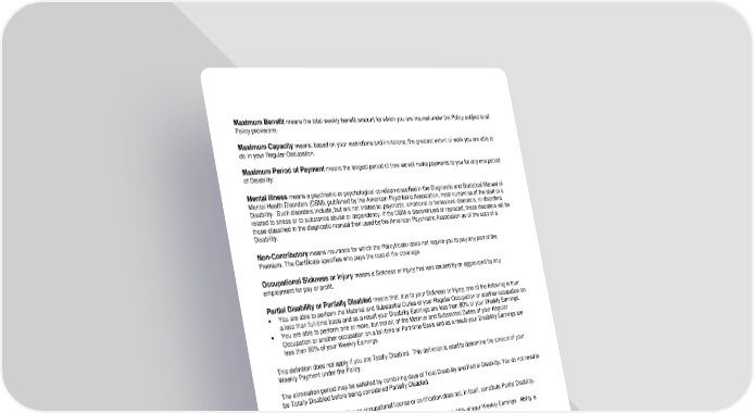 ICC19 RL-STD-CERT-19 7 D12972 (11/25) Maximum Benefit means the total weekly benefit amount for which you are insured under the Policy subject to all Policy provisions. Maximum Capacity means, based on your restrictions and limitations, the greatest extent of work you are able to do in your Regular Occupation. Maximum Period of Payment means the longest period of time we will make payments to you for any one period of Disability. Mental Illness means a psychiatric or psychological condition classified in the Diagnostic and Statistical Manual of Mental Health Disorders (DSM), published by the American Psychiatric Association, most current as of the start of a Disability. Such disorders include, but are not limited to: psychotic, emotional or behavioral disorders, or disorders related to stress or to substance abuse or dependency. If the DSM is discontinued or replaced, these disorders will be those classified in the diagnostic manual then used by the American Psychiatric Association as of the start of a Disability. Non-Contributory means insurance for which the Policyholder does not require you to pay any part of the Premium. The Certificate specifies who pays the cost of the coverage. Occupational Sickness or Injury means a Sickness or Injury that was caused by or aggravated by any employment for pay or profit. Partial Disability or Partially Disabled means that, due to your Sickness or Injury, one of the following is true: You are able to perform the Material and Substantial Duties of your Regular Occupation or another occupation on a less than full-time basis and as a result your Disability Earnings are less than 80% of your Weekly Earnings. You are able to perform one or more, but not all, of the Material and Substantial Duties of your Regular Occupation or another occupation on a full-time or Part-time Basis and as a result your Disability Earnings are less than 80% of your Weekly Earnings. This definition does not apply if you are Totally Disabled. This definition is used to determine the amount of your Weekly Payment under the Policy. The elimination period may be satisfied by combining days of Total Disability and Partial Disability. You do not need to be Totally Disabled before being considered Partially Disabled. The loss of a professional or an occupational license or certification does not, in itself, constitute Partial Disability. Part-time Basis means the ability to work and earn from 20% through 80% of your Weekly Earnings. Ability is based on capacity and not market availability. Payable Claim means a claim for which we are liable under the terms of the Policy. Policy means the Written group insurance contract between us and the Policyholder. Policyholder means the Employer to whom the Policy is issued and who sponsors and administers the coverage for its Employees. Premium means the amount the Policyholder will pay to us for the insurance provided under the Policy. Prior Policy means the Policyholder’s short term disability income insurance policy and the individual disability income policy for which you were insured on the day prior to the effective date of our Policy.