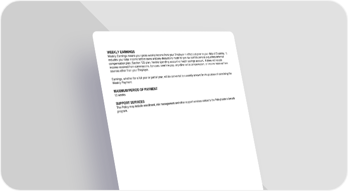 ICC19 RL-STD-CERT-19 4 D12972 (11/25) WEEKLY EARNINGS Weekly Earnings means your gross weekly income from your Employer in effect just prior to your date of Disability. It includes your total income before taxes and any deductions made for pre-tax contributions to a qualified deferred compensation plan, Section 125 plan, flexible spending account or health savings account. It does not include income received from commissions, bonuses, overtime pay, any other extra compensation, or income received from sources other than your Employer. Earnings, whether for a full year or partial year, will be converted to a weekly amount for the purpose of calculating the Weekly Payment. MAXIMUM PERIOD OF PAYMENT 13 weeks SUPPORT SERVICES The Policy may include enrollment, risk management and other support services related to the Policyholder’s benefit program.