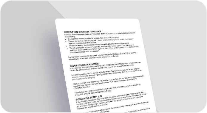 ICC18 LR14GP-SPR-2 4 SPR-12995 (11/25) EFFECTIVE DATE OF CHANGES TO COVERAGE Once your Spouse’s coverage begins, any increased or additional Contributory coverage will take effect on the latest of the following: The date of the increased or additional coverage, if you are in Active Employment. The date you return to Active Employment, if you are not in Active Employment on the date the increased or additional coverage would otherwise start. The date we approve your Spouse’s Evidence of Insurability, if Evidence of Insurability is required. The date your Spouse is no longer hospitalized, or confined at home under a doctor’s care, or receiving or applying to receive disability benefits from any source, if any of these conditions are true on the date the increased or additional coverage would otherwise start. Any decrease in coverage other than benefit reductions noted on the SCHEDULE OF BENEFITS will take effect immediately but will not affect a payable claim that occurs prior to the decrease. CHANGE OF INSURANCE CARRIERS If your coverage is being provided under the CHANGE OF INSURANCE CARRIERS provision in the Certificate, then we will also provide continuity of Spouse coverage under the same conditions and for the same duration. Any benefits payable under this provision will be the lesser of the amount of coverage under the prior policy had it remained in force, or the amount of eligible Spouse coverage under our Policy. We will reduce our payment by any amount paid under the prior policy. If Spouse coverage under this provision ends while the Policy is in force, and your Spouse is not otherwise eligible for insurance under the Policy, then your Spouse coverage will be eligible for conversion as described in the CONVERSION provision. If your Spouse was not covered under the Employer's prior policy on the date that policy terminated, then the EFFECTIVE DATE OF COVERAGE provision will apply. SPOUSE ACTIVE MILITARY DUTY If your Spouse is insured under this rider and your Spouse begins full-time active duty in the armed forces of any country or subdivision thereof, then you should notify the Policyholder to cancel this rider. Coverage under this rider will terminate at the beginning of the period during which your Spouse is no longer eligible, and any unearned Premiums that were collected will be refunded. If your Spouse’s full time active military duty ends, then Spouse coverage under this rider will become effective on the date your Spouse is again eligible for coverage. If your Spouse’s full-time active military duty ends, then you may re-enroll for Contributory Spouse coverage under this rider subject to the following: If you re-enroll for Contributory Spouse coverage within 2 months of the date your Spouse is again eligible for coverage, then the maximum amount of Contributory Spouse coverage available will be the lesser of the amount that was in effect on the day before coverage ended and the then current maximum amount of Contributory Spouse coverage available under this rider. Contributory Spouse coverage will become effective on the later of the following: The date you re-enroll for Contributory Spouse coverage, if you are in Active Employment. The date your Spouse is not hospitalized or confined at home under a doctor’s care. The date your Spouse is not receiving or applying to receive disability benefits from any source. The date you return to Active Employment, if you are not in Active Employment when your Contributory Spouse coverage would otherwise become effective. Exception: Contributory coverage starts on a non- working day if you were in Active Employment on your last scheduled working day before the non-working day. Non-working days include time off for the following: vacations, personal holidays, weekends and holidays, approved nonmedical leave of absence and paid time off for nonmedical-related absences. If you re-enroll for Contributory Spouse coverage more than 2 months after your Spouse is again eligible for coverage, then Evidence of Insurability on your Spouse will be required. If Evidence of Insurability is approved by us, Contributory Spouse coverage will become effective on the date specified by us.