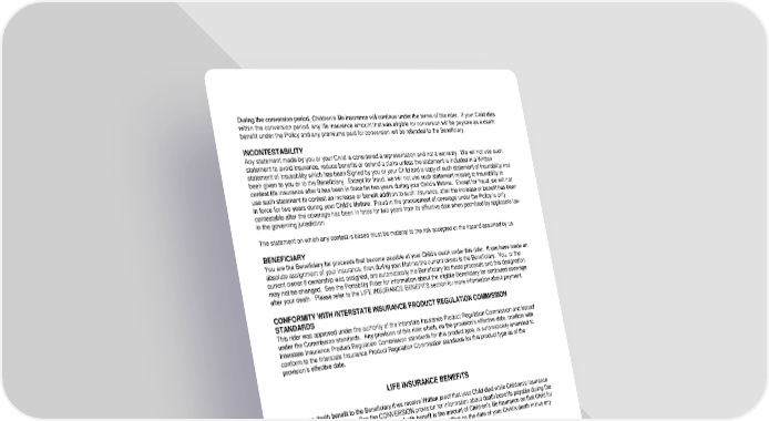 ICC18 LR14GP-CHR-2 6 CHR-12995 (11/25) During the conversion period, Children’s life insurance will continue under the terms of this rider. If your Child dies within the conversion period, any life insurance amount that was eligible for conversion will be payable as a death benefit under the Policy and any premiums paid for conversion will be refunded to the Beneficiary. INCONTESTABILITY Any statement made by you or your Child is considered a representation and not a warranty. We will not use such statement to avoid insurance, reduce benefits or defend a claim unless the statement is included in a Written statement of insurability which has been Signed by you or your Child and a copy of such statement of insurability has been given to you or to the Beneficiary. Except for fraud, we will not use such statement relating to insurability to contest life insurance after it has been in force for two years during your Child’s lifetime. Except for fraud, we will not use such statement to contest an increase or benefit addition to such insurance, after the increase or benefit has been in force for two years during your Child’s lifetime. Fraud in the procurement of coverage under the Policy is only contestable after the coverage has been in force for two years from its effective date when permitted by applicable law in the governing jurisdiction. The statement on which any contest is based must be material to the risk accepted or the hazard assumed by us. LIFE INSURANCE BENEFITS We pay a death benefit to the Beneficiary if we receive Written proof that your Child died while Children’s insurance under this rider is in force. See the CONVERSION provision for information about death benefits payable during the conversion period following your death. The death benefit is the amount of Children’s life insurance on that Child for the eligible class as shown on the SCHEDULE OF BENEFITS in effect on the date of your Child’s death minus any amount paid under the Accelerated Death Benefit Rider. NOTICE OF CLAIM AND PROOF OF LOSS A claim form is available from the Employer or us. The process for completing the claim form and submitting the claim form will be explained in the claim form paperwork. Proof of loss, including any attachments indicated on the claim form as required, should be sent directly to us at the address indicated on the form. We may also require information from the Employer in order to verify eligibility. Proof of loss consists of a certified copy of your Child’s death certificate or other lawful evidence providing equivalent information, and proof of the claimant’s interest in the proceeds. We will review proof of loss we receive in order to determine our liability and the correct payee(s). If we approve the claim, we will pay the benefits subject to the terms of this rider. BENEFICIARY You are the Beneficiary for proceeds that become payable at your Child’s death under this rider. If you have made an absolute assignment of your insurance, then during your lifetime the current owner is the Beneficiary. You, or the current owner if ownership was assigned, are automatically the Beneficiary for these proceeds and this designation may not be changed. See the Portability Rider for information about the eligible Beneficiary for continued coverage after your death. Please refer to the LIFE INSURANCE BENEFITS section for more information about payment. CONFORMITY WITH INTERSTATE INSURANCE PRODUCT REGULATION COMMISSION STANDARDS This rider was approved under the authority of the Interstate Insurance Product Regulation Commission and issued under the Commission standards. Any provision of this rider which, on the provision’s effective date, conflicts with Interstate Insurance Product Regulation Commission standards for this product type, is automatically amended to conform to the Interstate Insurance Product Regulation Commission standards for this product type as of the provision’s effective date.