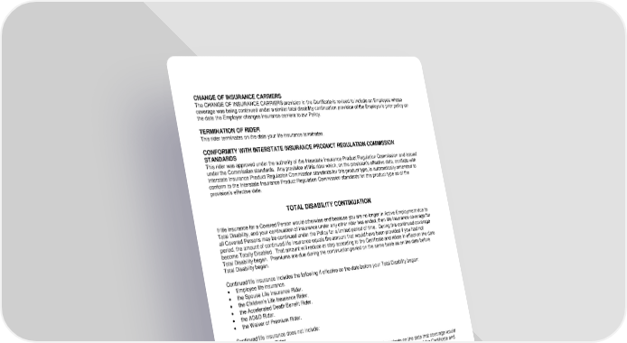 ICC18 LR14GP-CTD-2 2 CTD-12995 (11/25) CHANGE OF INSURANCE CARRIERS The CHANGE OF INSURANCE CARRIERS provision in the Certificate is revised to include an Employee whose coverage was being continued under a similar total disability continuation provision of the Employer’s prior policy on the date the Employer changes insurance carriers to our Policy. TERMINATION OF RIDER This rider terminates on the date your life insurance terminates. CONFORMITY WITH INTERSTATE INSURANCE PRODUCT REGULATION COMMISSION STANDARDS This rider was approved under the authority of the Interstate Insurance Product Regulation Commission and issued under the Commission standards. Any provision of this rider which, on the provision’s effective date, conflicts with Interstate Insurance Product Regulation Commission standards for this product type, is automatically amended to conform to the Interstate Insurance Product Regulation Commission standards for this product type as of the provision’s effective date. TOTAL DISABILITY CONTINUATION If life insurance for a Covered Person would otherwise end because you are no longer in Active Employment due to Total Disability, and your continuation of insurance under any other rider has ended, then life insurance coverage for all Covered Persons may be continued under the Policy for a limited period of time. During this continued coverage period, the amount of continued life insurance equals the amount that would have been provided if you had not become Totally Disabled. That amount will reduce or stop according to the Certificate and riders in effect on the date Total Disability began. Premiums are due during the continuation period on the same basis as on the date before Total Disability began. Continued life insurance includes the following if effective on the date before your Total Disability began: Employee life insurance. the Spouse Life Insurance Rider. the Children’s Life Insurance Rider. the Accelerated Death Benefit Rider. the AD&D Rider. the Waiver of Premium Rider. Continued life insurance does not include: the Portability Rider. any other continuation rider(s). Any rider or coverage that is not eligible for continuation under this rider will terminate on the date that coverage would otherwise end due to your termination of Active Employment. See the CONVERSION provision of the Certificate and riders for more information about conversion. Continued insurance is subject to all other terms of the Policy. CONDITIONS FOR TOTAL DISABILITY CONTINUATION All of the following conditions must be met in order to continue coverage under this rider: You are covered under this rider on the date your Total Disability begins. You are continuously Totally Disabled for the entire period your coverage is in force during the continuation period of any rider. All Premiums due for life insurance and this rider are paid to us through the date we approve your claim under this rider. NOTICE OF CLAIM AND PROOF OF TOTAL DISABILITY We must accept your proof of Total Disability in order for this rider to apply. You may request a claim form from the Employer or us in order to submit your proof of Total Disability to us. Proof of your Total Disability includes information from your Doctor, at your expense, regarding your condition and your inability to work. We may require additional