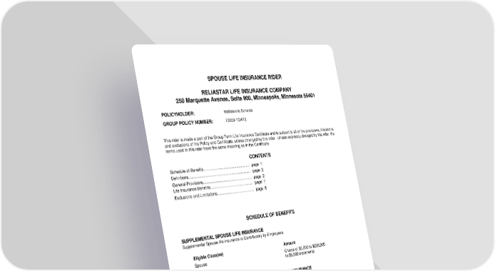 ICC18 LR14GP-SPR-2 1 SPR-12995 (11/25) This rider is made a part of the Group Term Life Insurance Certificate and is subject to all of the provisions, limitations and exclusions of the Policy and Certificate, unless changed by this rider. Unless expressly changed by this rider, the terms used in this rider have the same meaning as in the Certificate. SUPPLEMENTAL SPOUSE LIFE INSURANCE Supplemental Spouse life insurance is Contributory by Employees. MAXIMUM AMOUNT OF SUPPLEMENTAL SPOUSE LIFE INSURANCE $250,000 not to exceed 50% of the Supplemental Employee life insurance amount in force BENEFIT REDUCTIONS The Spouse insurance amount will decrease as follows: To 45% of the original amount on your 70th birthday. To 30% of the original amount on your 75th birthday. To 20% of the original amount on your 80th birthday. To 15% of the original amount on your 85th birthday. To 10% of the original amount on your 90th birthday. Reduced insurance amounts are not rounded. SPOUSE LIFE INSURANCE RIDER RELIASTAR LIFE INSURANCE COMPANY 250 Marquette Avenue, Suite 900, Minneapolis, Minnesota 55401 POLICYHOLDER: Noblesville Schools GROUP POLICY NUMBER: 73058-1GAT2 CONTENTS Schedule of Benefits................................................ page 1 Definitions................................................................ page 2 General Provisions................................................... page 2 Life Insurance Benefits............................................. page 7 Exclusions and Limitations....................................... page 8 SCHEDULE OF BENEFITS Eligible Class(es) Amount Spouse Choice of $5,000 to $250,000 in $5,000 increments