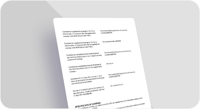 ICC18 LC14GP-2 8 D12995 (11/25) Enrollment for supplemental coverage on the Policy effective date, for employees who had supplemental coverage under the Employer's prior Policy… Any amount of total Supplemental Life Insurance exceeding $300,000 Enrollment for supplemental coverage on the Policy effective date, for employees who had no supplemental coverage under the Employer's prior Policy… Any amount exceeding $300,000 Enrollment at a scheduled annual enrollment period after the Policy effective date for an increase to existing supplemental coverage… Any amount of total Supplemental Life Insurance exceeding $300,000 Enrollment at a scheduled annual enrollment period after the Policy effective date for initial supplemental coverage… All amounts Enrollment within 31 days after a change in family status as documented and approved by the Employer and valid during this enrollment… Any amount of total Supplemental Life Insurance exceeding $300,000 Any new or increased supplemental coverage not described above, including enrollments more than 31 days after initial eligibility… All increased amounts EFFECTIVE DATE OF COVERAGE For Noncontributory coverage, you will be covered at 12:01 a.m. standard time at the Policyholder’s address on the date you are eligible for coverage. For Contributory coverage, you will be covered at 12:01 a.m. standard time at the Policyholder’s address on the latest of the following: The date you are eligible for coverage, if you enroll for coverage on or before that date. The date you enroll for coverage. The date we approve your Evidence of Insurability, if Evidence of Insurability is required. The date you return to Active Employment, if you are not in Active Employment when your coverage would otherwise become effective. Exception: Coverage starts on a non-working day if you were in Active Employment on your last scheduled working day before the non-working day. Non-working days include time off for the following: vacations, personal holidays, weekends and holidays, approved nonmedical leave of absence and paid time off for nonmedical-related absences.