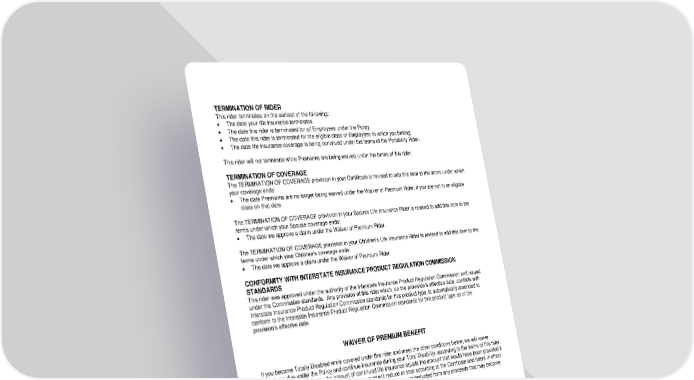 ICC18 LR14GP-WOP-2 2 WOP-12995 (11/25) TERMINATION OF RIDER This rider terminates on the earliest of the following: The date your life insurance terminates. The date this rider is terminated for all Employees under the Policy. The date this rider is terminated for the eligible class of Employees to which you belong. The date life insurance coverage is being continued under the terms of the Portability Rider. This rider will not terminate while Premiums are being waived under the terms of this rider. TERMINATION OF COVERAGE The TERMINATION OF COVERAGE provision in your Certificate is revised to add this item to the terms under which your coverage ends: The date Premiums are no longer being waived under the Waiver of Premium Rider, if you are not in an eligible class on that date. The TERMINATION OF COVERAGE provision in your Spouse Life Insurance Rider is revised to add this item to the terms under which your Spouse coverage ends: The date we approve a claim under the Waiver of Premium Rider. The TERMINATION OF COVERAGE provision in your Children’s Life Insurance Rider is revised to add this item to the terms under which your Children’s coverage ends: The date we approve a claim under the Waiver of Premium Rider. CONFORMITY WITH INTERSTATE INSURANCE PRODUCT REGULATION COMMISSION STANDARDS This rider was approved under the authority of the Interstate Insurance Product Regulation Commission and issued under the Commission standards. Any provision of this rider which, on the provision’s effective date, conflicts with Interstate Insurance Product Regulation Commission standards for this product type, is automatically amended to conform to the Interstate Insurance Product Regulation Commission standards for this product type as of the provision’s effective date. WAIVER OF PREMIUM BENEFIT If you become Totally Disabled while covered under this rider and meet the other conditions below, we will waive Premiums due under the Policy and continue insurance during your Total Disability, according to the terms of this rider. When we waive Premiums, the amount of continued life insurance equals the amount that would have been provided if you had not become Totally Disabled. That amount will reduce or stop according to the Certificate and riders in effect on the date Total Disability began. Premiums that are waived are not deducted from any proceeds that may become payable. Continued life insurance includes the following if effective on the date before your Total Disability began: Employee life insurance. the Accelerated Death Benefit Rider. Continued life insurance does not include: the Spouse Life Insurance Rider. the Children’s Life Insurance Rider. the AD&D Rider. the Portability Rider. any continuation rider(s). Any rider or coverage that is not eligible for waiver of premium under this rider will terminate on the date that coverage would otherwise end due to your termination of Active Employment. See the CONVERSION provision of the Certificate and riders for more information about conversion. Continued insurance is subject to all other terms of the Policy.