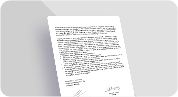 ICC18 LR14GP-CNT-2 5 CNT-12995 (11/25) Prior to rendering an adverse decision on appeal, we will provide notice to you of any new or additional evidence considered, relied upon, or generated by the plan, insurers or other persons making the benefit determination. We will also notify you if we have new or additional rationale for an adverse appeal determination. We will then provide you with a reasonable opportunity to review and respond to this new information before making our decision. The time period we have to make our determination will be tolled while we are waiting for your response. Following our review of the appeal, we will provide you with a written decision of the final determination of the claim. This decision will be issued as soon as possible, but no more than 45 days after the receipt of the appeal unless an extension is needed. An extension of 45 days will be allowed for making this decision if special circumstances are present. You will be given notice of any such extension before the end of the 45-day period. The notice will state the special circumstances involved and the date a decision is expected. If an extension is needed due to your failure to submit information necessary to decide a claim, the extension period will be tolled from the date on which notification of the extension is sent to you until the date on which you respond to the request for additional information. If we send an adverse benefit determination following our review of the appeal, the notice of the determination will be written in an understandable manner and include the following: The specific reason(s) for the adverse benefit determination. Reference to the specific provision on which the determination is based. A statement that you are entitled to receive, upon request and free of charge, reasonable access to, and copies of, all documents, records and other information relevant to your claim. A statement of your right to bring a civil action and any contractual statute of limitations period, including the specific calendar date on which such limitations period will expire. If an internal rule, guideline, protocol or other similar criterion was relied upon in making the adverse benefit determination, then a copy of any such rule, guideline, protocol or other criterion will be provided free of charge. The following statement: “You and your plan may have other voluntary alternative dispute resolution options, such as mediation. One way to find out what may be available is to contact your local U.S. Department of Labor Office and your State insurance regulatory agency.” Executed at our Home Office: 250 Marquette Avenue, Suite 900 Minneapolis, MN 55401 Amelia (Amy) J. Vaillancourt Melissa A. O'Donnell President Secretary