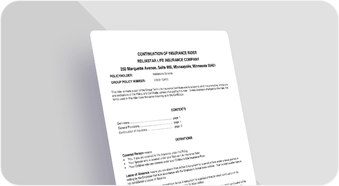 ICC18 LR14GP-CNT-2 1 CNT-12995 (11/25) This rider is made a part of the Group Term Life Insurance Certificate and is subject to all of the provisions, limitations and exclusions of the Policy and Certificate, unless changed by this rider. Unless expressly changed by this rider, the terms used in this rider have the same meaning as in the Certificate. Covered Person means: You, if you are covered for life insurance under the Policy. Your Spouse who is covered under your Spouse Life Insurance Rider. Your Children who are covered under your Children’s Life Insurance Rider. Leave of Absence means you are absent from Active Employment for a period of time under a leave granted in writing by the Employer that is in accordance with the Employer’s formal leave policies. Your normal vacation time is not considered a Leave of Absence. Labor Strike means you are absent from Active Employment for a period of time for which continuation of life insurance is available under the Employer’s written plan for labor strikes. Temporary Layoff means you are absent from Active Employment for a period of time for which continuation of life insurance is available under the Employer’s written plan for temporary layoffs, and the layoff is not intended to be permanent. Total Disability or Totally Disabled means that due to an injury or sickness you are unable to perform the material duties of your regular job, and you are unable to perform any other job for which you are fit by education, training or experience. GENERAL PROVISIONS ELIGIBILITY FOR RIDER If you are covered under the Policy, then you are eligible for this rider on the latest of the following: The Policy effective date. The date this rider is available to the eligible class of Employees to which you belong. Your life insurance coverage effective date. CONTINUATION OF INSURANCE RIDER RELIASTAR LIFE INSURANCE COMPANY 250 Marquette Avenue, Suite 900, Minneapolis, Minnesota 55401 POLICYHOLDER: Noblesville Schools GROUP POLICY NUMBER: 73058-1GAT2 CONTENTS Definitions................................................................ page 1 General Provisions................................................... page 1 Continuation of Insurance........................................ page 2 DEFINITIONS