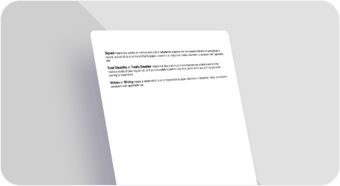 ICC18 LC14GP-2 6 D12995 (11/25) Signed means any symbol or method executed or adopted by a person with the present intention to authenticate a record, and which is on or transmitted by paper, electronic or telephonic media, and which is consistent with applicable law. Total Disability or Totally Disabled means that due to an injury or sickness you are unable to perform the material duties of your regular job, and you are unable to perform any other job for which you are fit by education, training or experience. Written or Writing means a record which is on or transmitted by paper, electronic or telephonic media, and which is consistent with applicable law.