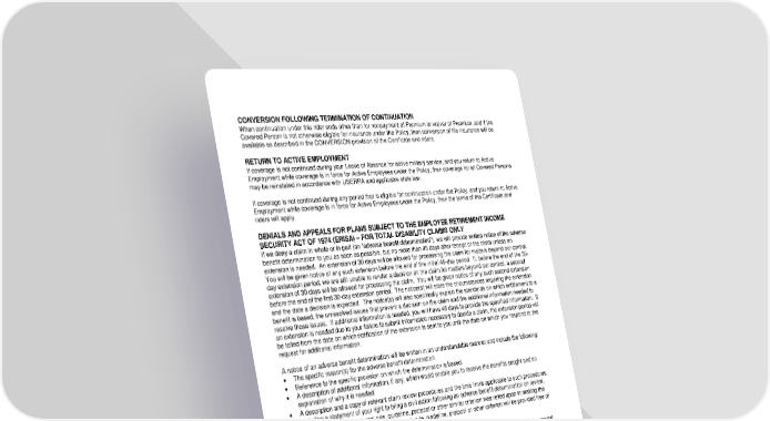 ICC18 LR14GP-CNT-2 4 CNT-12995 (11/25) CONVERSION FOLLOWING TERMINATION OF CONTINUATION When continuation under this rider ends other than for nonpayment of Premium or waiver of Premium, and if the Covered Person is not otherwise eligible for insurance under the Policy, then conversion of life insurance will be available as described in the CONVERSION provision of the Certificate and riders. RETURN TO ACTIVE EMPLOYMENT If coverage is not continued during your Leave of Absence for active military service, and you return to Active Employment while coverage is in force for Active Employees under the Policy, then coverage for all Covered Persons may be reinstated in accordance with USERRA and applicable state law. If coverage is not continued during any period that is eligible for continuation under the Policy, and you return to Active Employment while coverage is in force for Active Employees under the Policy, then the terms of the Certificate and riders will apply. DENIALS AND APPEALS FOR PLANS SUBJECT TO THE EMPLOYEE RETIREMENT INCOME SECURITY ACT OF 1974 (ERISA) – FOR TOTAL DISABILITY CLAIMS ONLY If we deny a claim in whole or in part (an “adverse benefit determination”), we will provide written notice of the adverse benefit determination to you as soon as possible, but no more than 45 days after receipt of the claim unless an extension is needed. An extension of 30 days will be allowed for processing the claim for matters beyond our control. You will be given notice of any such extension before the end of the initial 45-day period. If, before the end of the 30- day extension period, we are still unable to render a decision on the claim for matters beyond our control, a second extension of 30 days will be allowed for processing the claim. You will be given notice of any such second extension before the end of the first 30-day extension period. The notice(s) will state the circumstances requiring the extension and the date a decision is expected. The notice(s) will also specifically explain the standards on which entitlement to a benefit is based, the unresolved issues that prevent a decision on the claim and the additional information needed to resolve those issues. If additional information is needed, you will have 45 days to provide the specified information. If an extension is needed due to your failure to submit information necessary to decide a claim, the extension period will be tolled from the date on which notification of the extension is sent to you until the date on which you respond to the request for additional information. A notice of an adverse benefit determination will be written in an understandable manner and include the following: The specific reason(s) for the adverse benefit determination. Reference to the specific provision on which the determination is based. A description of additional information, if any, which would enable you to receive the benefits sought and an explanation of why it is needed. A description and a copy of relevant claim review procedures and the time limits applicable to such procedures, including a statement of your right to bring a civil action following an adverse benefit determination on review. A statement that if an internal rule, guideline, protocol or other similar criterion was relied upon in making the adverse benefit determination, a copy of such rule, guideline, protocol or other criterion will be provided free of charge to you upon request. You may request a review of an adverse benefit determination (an “appeal”) at any time during the 180 day period following receipt of the notice of the determination. We will consider an appeal upon written application of you or your duly authorized representative. As part of the appeal you also have the right, upon request and free of charge, to reasonable access to and copies of all documents, records and other information relevant to your claim. This includes the identification of any medical or vocational experts whose advice was obtained on our behalf in connection with the adverse benefit determination, without regard to whether the advice was relied upon in making the benefit determination. You may, in the course of this appeal, review relevant documents and submit to us written comments, documents, records and other information relevant to your claim. Our review of the appeal will be conducted by someone who is neither the individual who made the original adverse benefit determination that is the subject of the appeal, nor the subordinate of such individual. If the determination was based in whole or in part on a medical judgment, our review of the appeal will include consultation with a health care professional who has appropriate training and experience in the field of medicine involved in the medical judgment. This health care professional will be someone who is neither an individual who was consulted in connection with the original adverse benefit determination that is the subject of the appeal, nor the subordinate of such individual.
