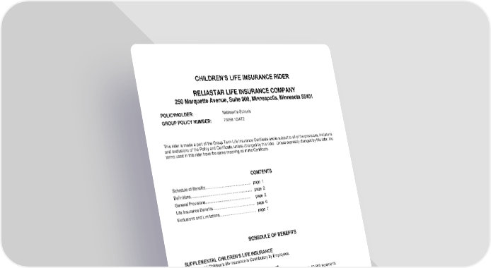 ICC18 LR14GP-CHR-2 1 CHR-12995 (11/25) This rider is made a part of the Group Term Life Insurance Certificate and is subject to all of the provisions, limitations and exclusions of the Policy and Certificate, unless changed by this rider. Unless expressly changed by this rider, the terms used in this rider have the same meaning as in the Certificate. SUPPLEMENTAL CHILDREN’S LIFE INSURANCE Supplemental Children’s life insurance is Contributory by Employees. Eligible Class(es) Amount Child or Children Choice of $2,500 to $10,000 in $2,500 increments CHILDREN’S LIFE INSURANCE RIDER RELIASTAR LIFE INSURANCE COMPANY 250 Marquette Avenue, Suite 900, Minneapolis, Minnesota 55401 POLICYHOLDER: Noblesville Schools GROUP POLICY NUMBER: 73058-1GAT2 CONTENTS Schedule of Benefits................................................ page 1 Definitions................................................................ page 2 General Provisions................................................ page 2 Life Insurance Benefits............................................. page 6 Exclusions and Limitations....................................... page 7 SCHEDULE OF BENEFITS MAXIMUM AMOUNT OF SUPPLEMENTAL CHILDREN’S LIFE INSURANCE $10,000 The Supplemental Children’s life insurance amount will not exceed the Supplemental Employee life insurance amount in force. You may not elect a higher amount of Supplemental Children’s life insurance than Supplemental Employee life insurance.