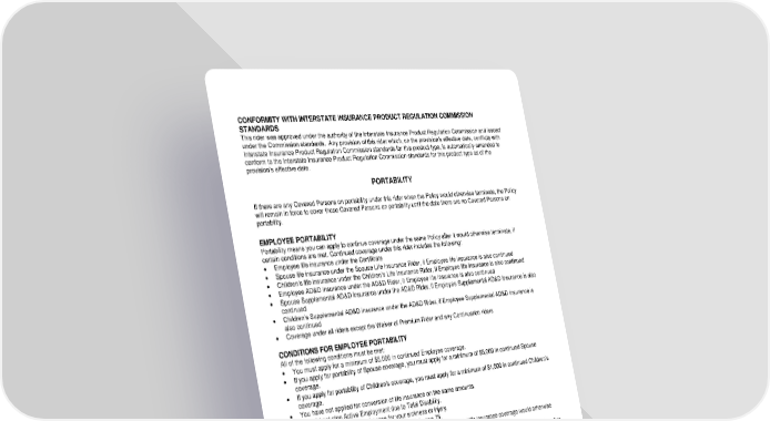 ICC18 LR14GP-PTS-2 2 PTS-12995 (11/25) CONFORMITY WITH INTERSTATE INSURANCE PRODUCT REGULATION COMMISSION STANDARDS This rider was approved under the authority of the Interstate Insurance Product Regulation Commission and issued under the Commission standards. Any provision of this rider which, on the provision’s effective date, conflicts with Interstate Insurance Product Regulation Commission standards for this product type, is automatically amended to conform to the Interstate Insurance Product Regulation Commission standards for this product type as of the provision’s effective date. EMPLOYEE PORTABILITY Portability means you can apply to continue coverage under the same Policy after it would otherwise terminate, if certain conditions are met. Continued coverage under this rider includes the following: Employee life insurance under the Certificate Spouse life insurance under the Spouse Life Insurance Rider, if Employee life insurance is also continued Children’s life insurance under the Children’s Life Insurance Rider, if Employee life insurance is also continued Employee AD&D insurance under the AD&D Rider, if Employee life insurance is also continued Spouse Supplemental AD&D Insurance under the AD&D Rider, if Employee Supplemental AD&D Insurance is also continued Children’s Supplemental AD&D insurance under the AD&D Rider, if Employee Supplemental AD&D insurance is also continued Coverage under all riders except the Waiver of Premium Rider and any Continuation riders CONDITIONS FOR EMPLOYEE PORTABILITY All of the following conditions must be met: You must apply for a minimum of $5,000 in continued Employee coverage. If you apply for portability of Spouse coverage, you must apply for a minimum of $5,000 in continued Spouse coverage. If you apply for portability of Children’s coverage, you must apply for a minimum of $1,000 in continued Children’s coverage. You have not applied for conversion of life insurance on the same amounts. You did not stop Active Employment due to Total Disability. You are not on a leave of absence for your sickness or injury. You apply for portability before the date you attain age 75. You apply for portability within 31 days of the date your Supplemental life insurance coverage would otherwise terminate due to any of the following: You retire or terminate employment with the Employer, if coverage remains in effect under the Policy for other Active Employees. The Policyholder terminates coverage under the Policy for all Active Employees, and does not replace it with another life insurance plan. You are no longer in an eligible class for coverage under the Policy. Any other continuation provided under the Policy ends. You will be given notice of your portability and conversion rights at least 15 days before the date any part of your life insurance ends. Your portability rights will expire on the later of 16 days after you are given such notice or the end of the conversion period, but in no event will your portability rights extend beyond 60 days after the expiration of the conversion period. Portability is not available for any of the following: Any amounts of life insurance for which a conversion application has been received by us. Coverage that reduces due to BENEFIT REDUCTIONS as described on the SCHEDULE OF BENEFITS in the Certificate or any riders. PORTABILITY If there are any Covered Persons on portability under this rider when the Policy would otherwise terminate, the Policy will remain in force to cover those Covered Persons on portability until the date there are no Covered Persons on portability.