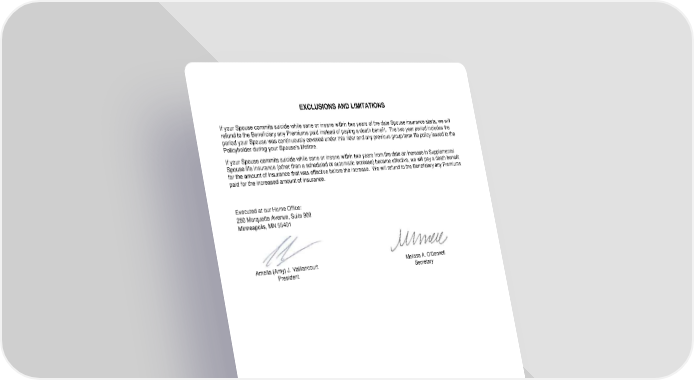 ICC18 LR14GP-SPR-2 8 SPR-12995 (11/25) EXCLUSIONS AND LIMITATIONS If your Spouse commits suicide while sane or insane within two years of the date Spouse insurance starts, we will refund to the Beneficiary any Premiums paid instead of paying a death benefit. The two year period includes the period your Spouse was continuously covered under this rider and any previous group term life policy issued to the Policyholder during your Spouse’s lifetime. If your Spouse commits suicide while sane or insane within two years from the date an increase in Supplemental Spouse life insurance (other than a scheduled or automatic increase) became effective, we will pay a death benefit for the amount of insurance that was effective before the increase. We will refund to the Beneficiary any Premiums paid for the increased amount of insurance. Executed at our Home Office: 250 Marquette Avenue, Suite 900 Minneapolis, MN 55401 Amelia (Amy) J. Vaillancourt Melissa A. O'Donnell President Secretary