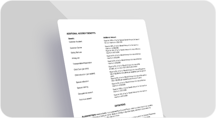 ICC18 LR14GP-ADD-2 4 ADD-12995 (11/25) ADDITIONAL ACCIDENT BENEFITS Benefit: Additional Amount: Common Accident Equal to 100% of the full Spouse Benefit Amount for loss of life to a maximum of $50,000 Common Carrier Equal to 50% of the full Benefit Amount for the loss to a maximum of $50,000 Safety Belt use Equal to 10% of the full Benefit Amount for loss of life to a maximum of $10,000 Airbag use Equal to 5% of the full Benefit Amount for loss of life to a maximum of $5,000 Transportation/Repatriation Equal to 2% of the full Benefit Amount for loss of life to a maximum of $2,000 Child Care (per child) Equal to 5% of the full Benefit Amount for loss of life annually up to a total of $10,000 for all children Child education (per student) Equal to 5% of the full Benefit Amount for loss of life up to a total of $3,000 for all students per academic year for up to 4 years. Spouse education Equal to 5% of the full Benefit Amount for loss of life up to a total of $3,000 per academic year for up to 4 years Spouse training Equal to 5% of the full Benefit Amount for loss of life to a maximum of $20,000 Occupational assault Equal to 100% of the full Benefit Amount for the loss to a maximum of $10,000 Felonious assault Equal to 10% of the full Benefit Amount for the loss to a maximum of $10,000 DEFINITIONS Accidental Injury means a bodily injury sustained by a Covered Person, which is a direct result of an accident, independent of disease or bodily or mental illness or infirmity or any other cause, and which occurs while the Covered Person’s insurance under this rider is in force. Airbag means a passenger restraint system properly installed in the Automobile in which the Covered Person was riding at the time of the Accidental Injury, which inflates for added protection to the head and chest areas. Automobile means any self-propelled private passenger vehicle which has four or more tires and which is not being used for commercial purposes. Child Care means any facility or private care that: is licensed as child care by the state, provides non-medical care and supervision for children, and is not operated by you or a member of your immediate family. Coma means a state of deep and total unconsciousness from which the comatose person cannot be aroused, as determined by a Doctor, and which continues for a period of 30 days. Common Accident means the same accident or separate accidents that occur within the same 24-hour period, that cause Accidental Injury to both you and your insured Spouse.