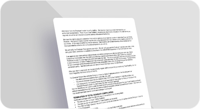 ICC18 LR14GP-CTD-2 3 CTD-12995 (11/25) information from the Employer in order to verify eligibility. We may also require you to be interviewed by our authorized representative. Proof of your Total Disability, including any attachments indicated on the claim form(s) as required, should be sent directly to us at the address indicated on the form(s). We have the right to request a second or third medical opinion, at our expense, in order to determine if you are Totally Disabled. Any second medical opinion may include a physical examination by a Doctor or other medical practitioner of our choice. In the case of conflicting medical opinions, Total Disability will be determined by a third medical opinion that is provided by a Doctor who is mutually acceptable to you and us. We will notify the Employer if we approve your claim. We will notify you and the Employer if we deny your claim. If we deny your claim, conversion is available as described in the CONVERSION provision of the Certificate and riders. If we approve your claim and you had previously converted coverage to an individual policy(ies) when your Active Employment terminated, then the individual policy(ies) must be surrendered without claim (other than refund of Premium) in order for coverage to be continued under this rider. The same coverage(s) that would otherwise end due to your termination of Active Employment may not be both continued under this rider and converted. The Beneficiary for your coverage will be the most recent Beneficiary designated under either the group Policy or the individual conversion policy. See the Certificate and riders for more information about the Beneficiary. After your claim is approved, we may periodically request additional proof of your continuing Total Disability, but not more frequently than once every six months. If a Covered Person dies while the Policy is in force for Active Employees and all of the following are true: You didn’t previously submit a claim under this rider, and You would otherwise have met the CONDITIONS FOR TOTAL DISABILITY CONTINUATION, and Life insurance for the Covered Person would still have been in force under the Policy on the date of the Covered Person’s death if a claim under this rider had been approved, then the Beneficiary can submit a claim for death benefit proceeds along with proof that your Total Disability continued without interruption from the last day you were in Active Employment until the Covered Person’s death. Any Premiums that would have been due for continued coverage must be paid. TERMINATION OF TOTAL DISABILITY CONTINUATION Continued coverage under this rider will stop on the earliest of the following dates: The date you are no longer Totally Disabled. The date you do not give us proof of Total Disability as requested. Your 65th birthday; however, the continuation period will not be less than 6 months while the Policy is in force for Active Employees. The date the Policy terminates. The date coverage for all Active Employees under the Policy terminates. For your Spouse and Children’s coverage, the date that person’s life insurance would otherwise end according to the terms of the rider(s). If coverage is no longer continued under this rider, insurance under the Policy will stay in force only if all of the following conditions are met: Life insurance is in force for Active Employees under the Policy, and You are in an eligible class for coverage under the Policy, and Your Premium payments are continued. The amount of insurance will be subject to the Certificate and riders in effect on the date you become eligible as an Active Employee. You will not be eligible for portability under the Portability Rider on the date continued coverage under this rider terminates.