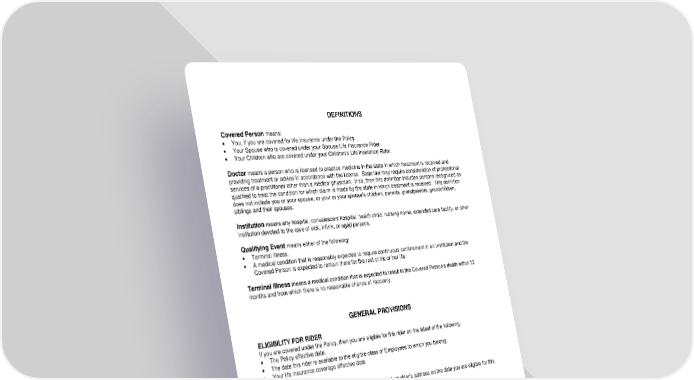 ICC14 LR14GP-ABR 2 ABR-12995 (11/25) DEFINITIONS Covered Person means: You, if you are covered for life insurance under the Policy. Your Spouse who is covered under your Spouse Life Insurance Rider. Your Children who are covered under your Children’s Life Insurance Rider. Doctor means a person who is licensed to practice medicine in the state in which treatment is received and providing treatment or advice in accordance with the license. State law may require consideration of professional services of a practitioner other than a medical physician. If so, then this definition includes persons recognized as qualified to treat the condition for which claim is made by the state in which treatment is received. This definition does not include you or your spouse, or your or your spouse’s children, parents, grandparents, grandchildren, siblings and their spouses. Institution means any hospital, convalescent hospital, health clinic, nursing home, extended care facility, or other institution devoted to the care of sick, infirm, or aged persons. Qualifying Event means either of the following: Terminal Illness. A medical condition that is reasonably expected to require continuous confinement in an Institution and the Covered Person is expected to remain there for the rest of his or her life. Terminal Illness means a medical condition that is expected to result in the Covered Person’s death within 12 months and from which there is no reasonable chance of recovery. GENERAL PROVISIONS ELIGIBILITY FOR RIDER If you are covered under the Policy, then you are eligible for this rider on the latest of the following: The Policy effective date. The date this rider is available to the eligible class of Employees to which you belong. Your life insurance coverage effective date. EFFECTIVE DATE OF RIDER You will be covered at 12:01 a.m. standard time at the Policyholder’s address on the date you are eligible for this rider. TERMINATION OF RIDER This rider terminates on the earliest of the following: The date your life insurance terminates. The date this rider is terminated for all Employees under the Policy. The date this rider is terminated for the eligible class of Employees to which you belong. This rider will not terminate while this rider is being continued under the terms of another rider. Termination of this rider will not prejudice the payment of benefits for a Qualifying Event that occurred while this rider was in force. CONVERSION When this rider terminates, conversion of this rider is not available.