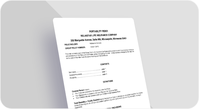 ICC18 LR14GP-PTS-2 1 PTS-12995 (11/25) This rider is made a part of the Group Term Life Insurance Certificate and is subject to all of the provisions, limitations and exclusions of the Policy and Certificate, unless changed by this rider. Unless expressly changed by this rider, the terms used in this rider have the same meaning as in the Certificate. Covered Person means: You, if you are covered for life insurance under the Policy. Your Spouse who is covered under your Spouse Life Insurance Rider. Your Children who are covered under your Children’s Life Insurance Rider. Total Disability or Totally Disabled means that due to an injury or sickness you are unable to perform the material duties of your regular job, and you are unable to perform any other job for which you are fit by education, training or experience. GENERAL PROVISIONS ELIGIBILITY FOR RIDER If you are covered under the Policy, then you are eligible for this rider on the latest of the following: The Policy effective date. The date this rider is available to the eligible class of Employees to which you belong. Your life insurance coverage effective date. EFFECTIVE DATE OF RIDER You will be covered at 12:01 a.m. standard time at the Policyholder’s address on the date you are eligible for this rider. TERMINATION OF RIDER This rider terminates on the earliest of the following: The date your life insurance terminates. The date this rider is terminated for all Employees under the Policy. The date this rider is terminated for the eligible class of Employees to which you belong. This rider will not terminate while your coverage is being continued under the terms of this rider. PORTABILITY RIDER RELIASTAR LIFE INSURANCE COMPANY 250 Marquette Avenue, Suite 900, Minneapolis, Minnesota 55401 POLICYHOLDER: Noblesville Schools GROUP POLICY NUMBER: 73058-1GAT2 CONTENTS Definitions................................................................ page 1 General Provisions................................................... page 1 Portability................................................................. page 2 DEFINITIONS