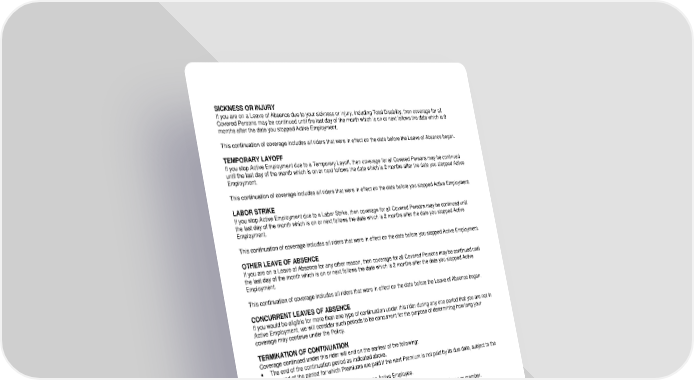 ICC18 LR14GP-CNT-2 3 CNT-12995 (11/25) SICKNESS OR INJURY If you are on a Leave of Absence due to your sickness or injury, including Total Disability, then coverage for all Covered Persons may be continued until the last day of the month which is on or next follows the date which is 9 months after the date you stopped Active Employment. This continuation of coverage includes all riders that were in effect on the date before the Leave of Absence began. TEMPORARY LAYOFF If you stop Active Employment due to a Temporary Layoff, then coverage for all Covered Persons may be continued until the last day of the month which is on or next follows the date which is 2 months after the date you stopped Active Employment. This continuation of coverage includes all riders that were in effect on the date before you stopped Active Employment. LABOR STRIKE If you stop Active Employment due to a Labor Strike, then coverage for all Covered Persons may be continued until the last day of the month which is on or next follows the date which is 2 months after the date you stopped Active Employment. This continuation of coverage includes all riders that were in effect on the date before you stopped Active Employment. OTHER LEAVE OF ABSENCE If you are on a Leave of Absence for any other reason, then coverage for all Covered Persons may be continued until the last day of the month which is on or next follows the date which is 2 months after the date you stopped Active Employment. This continuation of coverage includes all riders that were in effect on the date before the Leave of Absence began. CONCURRENT LEAVES OF ABSENCE If you would be eligible for more than one type of continuation under this rider during any one period that you are not in Active Employment, we will consider such periods to be concurrent for the purpose of determining how long your coverage may continue under the Policy. TERMINATION OF CONTINUATION Coverage continued under this rider will end on the earliest of the following: The end of the continuation period as indicated above. The end of the period for which Premiums are paid if the next Premium is not paid by its due date, subject to the grace period. The date you are eligible under the Policy as an Active Employee. The date of your death. The date you become covered under another group life insurance policy as an employee or member. The date Premiums are waived under the Waiver of Premium Rider. The date the Policy terminates. The date coverage for all Active Employees under the Policy terminates. In no event will coverage for any Covered Person be continued beyond the date coverage would otherwise end according to the termination provision(s) of the Certificate and riders. When this continuation ends, other than by waiver of Premium, insurance under the Policy will stay in force only if all of the following conditions are met: Life insurance is in force for Active Employees under the Policy, and You are in an eligible class for coverage under the Policy, and Your Premium payments are resumed. The amount of insurance will be subject to the Certificate and riders in effect on the date your Premium payments are resumed.