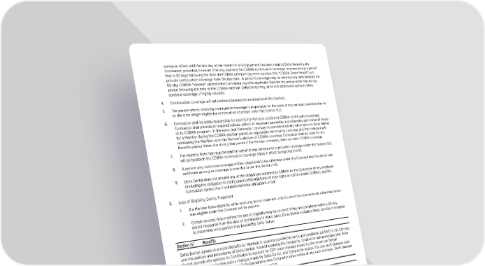 INPPOCONT1122 2 Revised 11/2022 KR#05809057 remain in effect until the last day of the month for which payment has been made to Delta Dental by the Contractor; provided, however, that any payment for COBRA continuation coverage received during a period that is 30 days following the date the COBRA premium payment was due (the COBRA Grace Period) will provide continuation coverage from the due date. A persons coverage may be retroactively reinstated for the 60-day COBRA election period if the Contractor pays the applicable Rate for the period within the 45-day period following the date of the COBRA election. Delta Dental may, at its sole option and without notice, continue coverage, if legally required. 4. Continuation coverage will not continue beyond the termination of this Contract. 5. The person who is receiving continuation coverage is responsible for the costs of any services provided after he or she is no longer eligible for continuation coverage under this Section III.D. 6. Contractor shall be solely responsible for identifying Members entitled to COBRA continuation coverage. Contractor shall provide all required notices, collect all necessary payments, and otherwise administer all facets of its COBRA program. In the event that Contractor continues to provide eligibility information to Delta Dental for a Member during the COBRA election period, as opposed to terminating coverage and then retroactively reinstating the Member upon the Members election of COBRA coverage, Contractor shall be liable for any Benefits paid or Rates due during that period if the Member ultimately does not elect COBRA coverage. 7. The monthly Rate that must be paid on behalf of any person who is provided coverage under this Section III.D. will be based on the COBRA continuation coverage Rates in effect during that month. 8. A person who continues coverage will be considered to be a Member under this Contract and the dental care certificate as long as coverage is provided under this Section III.D. 9. Delta Dental does not assume any of the obligations assigned by COBRA to the Contractor or any employer (including the obligation to notify potential beneficiaries of their rights or options under COBRA), and the Contractor agrees that it will perform those obligations in full. E. Loss of Eligibility During Treatment 1. If a Member loses eligibility while receiving dental treatment, only Covered Services received while that person was eligible under the Contract will be payable. 2. Certain services begun before the loss of eligibility may be covered if they are completed within a 60-day period measured from the date of termination. In those cases, Delta Dental evaluates those services in progress to determine what portion may be paid by Delta Dental. Section IV. Benefits Delta Dental agrees to provide Benefits to Members in accordance with the terms and conditions set forth in this Contract and the policies and procedures of Delta Dental. Notwithstanding the foregoing, Contractor acknowledges that Delta Dental periodically updates its Certificates to account for CDT code changes issued by the American Dental Association and processing policy changes made by Delta Dental, and Contractor agrees that any such changes shall apply to this Contract provided that Delta Dental provides Contractor prior notice of any such changes. Such changes shall become effective as of the date indicated in such notice. Section V. Agreements A. Delta Dental Agrees: 1. To provide all claims processing, service, and administration of Benefits Members of the Contractor subject to the terms and conditions of this Contract. 2. To provide to the Contractor, for submission to the Enrollee, a Certificate of the Benefits provided pursuant to this Contract. 3. To endeavor to enlist Dentists to become Participating Dentists in sufficient number to ensure an adequate choice of Dentists, and to make periodic checks as to the adequacy of care provided by Dentists to Members covered by this Contract. Delta Dental is not required to provide a dental appointment to a Member. 4. To contractually require each Participating Dentist to schedule and render all dental treatment provided under this Contract according to the standards of the dental profession in the community in which the dental procedures are rendered. 5. Delta Dental will pay or deny each clean claim within 45 days after receipt if the claim is filed on paper, and 30 days after receipt if the claim is filed electronically. If Delta Dental fails to pay or deny a clean claim in this time