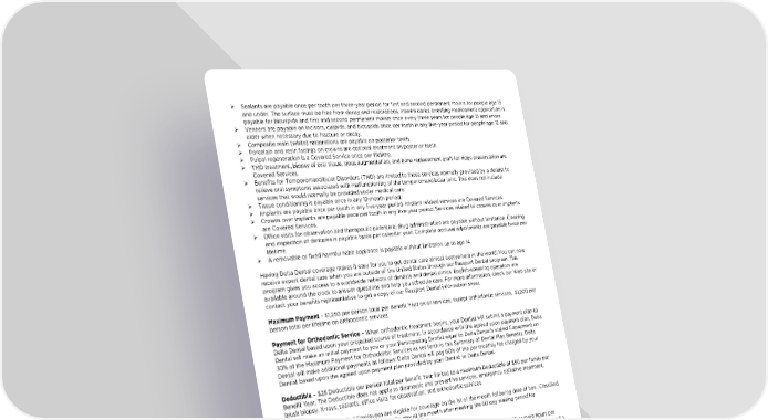 Sealants are payable once per tooth per three-year period for first and second permanent molars for people age 15 and under. The surface must be free from decay and restorations. Interim caries arresting medicament application is payable for bicuspids and first and second permanent molars once every three years for people age 15 and under. Veneers are payable on incisors, cuspids, and bicuspids once per tooth in any five-year period for people age 12 and older when necessary due to fracture or decay. Composite resin (white) restorations are payable on posterior teeth. Porcelain and resin facings on crowns are optional treatment on posterior teeth. Pulpal regeneration is a Covered Service once per lifetime. TMD treatment, biopsy of oral tissue, sinus augmentation, and bone replacement graft for ridge preservation are Covered Services. Benefits for Temporomandibular Disorders (TMD) are limited to those services normally provided by a dentist to relieve oral symptoms associated with malfunctioning of the temporomandibular joint. This does not include services that would normally be provided under medical care. Tissue conditioning is payable once in any 12-month period. Implants are payable once per tooth in any five-year period. Implant related services are Covered Services. Crowns over implants are payable once per tooth in any five-year period. Services related to crowns over implants are Covered Services. Office visits for observation and therapeutic parenteral drug administration are payable without limitation. Cleaning and inspection of dentures is payable twice per calendar year. Complete occlusal adjustments are payable twice per lifetime. A removable or fixed harmful habit appliance is payable without limitation up to age 14. Having Delta Dental coverage makes it easy for you to get dental care almost everywhere in the world! You can now receive expert dental care when you are outside of the United States through our Passport Dental program. This program gives you access to a worldwide network of dentists and dental clinics. English-speaking operators are available around the clock to answer questions and help you schedule care. For more information, check our Web site or contact your benefits representative to get a copy of our Passport Dental information sheet. Maximum Payment – $1,250 per person total per Benefit Year on all services, except orthodontic services. $1,200 per person total per lifetime on orthodontic services. Payment for Orthodontic Service – When orthodontic treatment begins, your Dentist will submit a payment plan to Delta Dental based upon your projected course of treatment. In accordance with the agreed upon payment plan, Delta Dental will make an initial payment to you or your Participating Dentist equal to Delta Dental's stated Copayment on 30% of the Maximum Payment for Orthodontic Services as set forth in this Summary of Dental Plan Benefits. Delta Dental will make additional payments as follows: Delta Dental will pay 60% of the per monthly fee charged by your Dentist based upon the agreed upon payment plan provided by your Dentist to Delta Dental. Deductible – $25 Deductible per person total per Benefit Year limited to a maximum Deductible of $50 per family per Benefit Year. The Deductible does not apply to diagnostic and preventive services, emergency palliative treatment, brush biopsy, X-rays, sealants, office visits for observation, and orthodontic services. Waiting Period – Certified Employees are eligible for coverage on the 1st of the month following date of hire. Classified Employees are eligible for coverage on the 1st day of the month after meeting the 60 day waiting period for employment. Eligible People – All active full-time & part-time Certified and Classified employees who work 30 or more hours per week (0001), retired teachers who have at least 15 years of service and are at least 55 years of age, retired teachers who have at least 10 years of service and are at least 60 years of age, retired administrators who have at least 10 years of service and are at least 55 years of age, retired classified employees who have at least 15 years of service and are at least 55 years of age, retired classified employees who have at least 10 years of service and are at least 60 years of age (0002) and (Consolidated Omnibus Budget Reconciliation Act of 1985) enrollees (0099), if applicable, who choose the Dental Plan. Also eligible are your Spouse and your Children to the end of the calendar year in which they turn 26, including your Children who are married, who no longer live with you, who are not your dependents for Federal income tax purposes, and/or who are not permanently disabled. The medical and Delta Dental plans are offered as a package. Employees enrolled in either plan are automatically enrolled in both plans with the same type of coverage. For example, employees enrolled with single coverage under the medical plan must also be enrolled with single coverage under the Delta Dental plan. KR#64690433