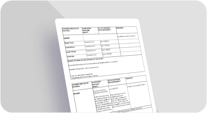 COVERED SERVICE OR IN-NETWORK OUT-OF-NETWORK FREQUENCY MATERIAL PROVIDER PROVIDER BENEFIT BENEFIT LENSES Available once each 12 months** Single Vision Covered in full * Up to $30.00* Lined Bifocal Covered in full * Up to $50.00* Lined Trifocal Covered in full * Up to $65.00* Lenticular Covered in full * Up to $100.00* Benefits for lenses are per complete set, not per lens. Polycarbonate lenses are covered in full for dependent children up to age 26. Standard Progressive Lenses covered in full. *Less any applicable Copayment. **Beginning with the first date of service. COVERED SERVICE OR IN-NETWORK OUT-OF-NETWORK FREQUENCY MATERIAL PROVIDER PROVIDER BENEFIT BENEFIT FRAMES Covered up to Plan Up to $70.00* Available once each 24 months** Allowance of $130.00* Frame Allowance may Frame Allowance may be be applied towards non- applied towards non- prescription sunglasses prescription sunglasses or or blue light filtering blue light filtering glasses, glasses, exhausting both exhausting both frame and frame and lens eligibility. lens eligibility. Lab-fabricated Lab-fabricated plano plano lenses are not covered. lenses are not covered. Benefits for lenses and frames include reimbursement for the following necessary professional services: 1. Prescribing and ordering proper lenses; 2. Assisting in frame selection; 3. Verifying accuracy of finished lenses; 4. Proper fitting and adjustments of frames; 5. Subsequent adjustments to frames to maintain comfort and efficiency; 6. Progress or follow-up work as necessary. Frame allowance may be applied towards non-prescription sunglasses for post PRK, LASIK, or Custom LASIK patients. *Less any applicable Copayment. **Beginning with the first date of service. COVERED SERVICE OR IN-NETWORK OUT-OF-NETWORK FREQUENCY MATERIAL PROVIDER PROVIDER BENEFIT BENEFIT CONTACT LENSES Necessary Available once each 12 months** VINPPOSUMM092022 2 KR#10267122