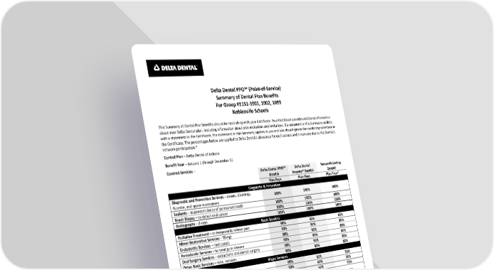 INPPOSUM1123 KR#08314644 Cone beam imaging is not payable. Sealants are payable once per tooth per three-year period for first and second permanent molars for people age 17 and under. The surface must be free from decay and restorations. Composite resin (white) restorations are payable on all teeth, including posterior teeth. Implants are payable once per tooth in any five-year period. Implant related services are Covered Services. Crowns over implants are payable once per tooth in any five-year period. Services related to crowns over implants are Covered Services. People with special health care needs may be eligible for additional services including exams, hygiene visits, dental case management, and sedation/anesthesia. Special health care needs include any physical, developmental, mental, sensory, behavioral, cognitive, or emotional impairment or limiting condition that requires medical management, healthcare intervention, and/or use of specialized services or programs. The condition may be congenital, developmental, or acquired through disease, trauma, or environmental cause and may impose limitations in performing daily self-maintenance activities or substantial limitations in a major life activity. Having Delta Dental coverage makes it easy for you to get dental care almost everywhere in the world! You can now receive expert dental care when you are outside of the United States through our Passport Dental program. This program gives you access to a worldwide network of Dentists and dental clinics. English-speaking operators are available around the clock to answer questions and help you schedule care. For more information, check our website or contact your benefits representative to get a copy of our Passport Dental information sheet. Maximum Payment – Delta Dental PPO™ Dentist or Delta Dental Premier® Dentist - The plan is designed to encourage yearly visits to your dentist for preventive care. The Maximum Payment for the first Benefit Year is $1,250 per Member total per Benefit Year on all services except orthodontic services. If an Eligible Member obtains preventive services in a Benefit Year, the Maximum Payment will increase in the following Benefit Year by $100 up to a Maximum Payment of $1,550 per Benefit Year. If one of the required services is not received in a Benefit Year, the Maximum Payment in the following Benefit Year will be reduced to $1,250. $1,250 per Member total per lifetime on orthodontic services. Nonparticipating Dentist - The plan is designed to encourage yearly visits to your dentist for preventive care. The Maximum Payment for the first Benefit Year is $1,250 per Member total per Benefit Year on all services except orthodontic services. If an Eligible Member obtains preventive services in a Benefit Year, the Maximum Payment will increase in the following Benefit Year by $100 up to a Maximum Payment of $1,550 per Benefit Year. If one of the required services is not received in a Benefit Year, the Maximum Payment in the following Benefit Year will be reduced to $1,250. $1,000 per Member total per lifetime on orthodontic services. These are not separate maximums by type of dentist. Payment for Orthodontic Service – When orthodontic treatment begins, your Dentist will submit a payment plan to Delta Dental based upon your projected course of treatment. In accordance with the agreed upon payment plan, Delta Dental will make an initial payment to you or your Participating Dentist equal to Delta Dental's stated Copayment on 30% of the Maximum Payment for Orthodontic Services as set forth in this Summary of Dental Plan Benefits. Delta Dental will make additional payments as follows: Delta Dental will pay 50% of the per month fee charged by your Dentist based upon the agreed upon payment plan provided by Delta Dental to your Dentist. Deductible – Delta Dental PPO™ Dentist or Delta Dental Premier® Dentist - None. Nonparticipating Dentist - $25 Deductible per Member total per Benefit Year limited to a maximum Deductible of $75 per family per Benefit Year. The Deductible does not apply to preventive services, X-rays, brush biopsy, sealants, and orthodontic services. Waiting Period – Enrollees who are eligible for Benefits are covered on the date that is defined by Noblesville Schools. Eligible People – All Active full-time employees and their dependents as defined by Noblesville Schools. Also eligible are your Spouse and your Children to the end of the calendar year in which they turn 26, including your Children who are married, who no longer live with you, who are not your dependents for Federal income tax purposes, and/or who are not permanently disabled. Enrollees and Dependents choosing this plan are required to remain enrolled for a minimum of 12 months. Should an Enrollee or Dependent choose to drop coverage after that time, he or she may not re-enroll prior to the date on which 12 months have elapsed. Dependents may only enroll if the Enrollee is enrolled (except under COBRA) and must be enrolled in the same plan as the Enrollee. An election may be revoked or changed at any time if the change is the result of a qualifying event as defined under Internal Revenue Code Section 125.