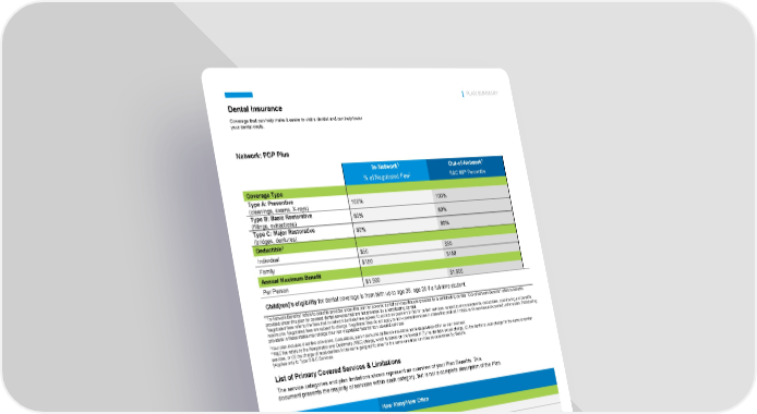 Metropolitan Life Insurance Company | 200 Park Avenue | New York, NY 10166 L0325047071[exp0327][xNM] © 2025 MetLife Services and Solutions, LLC DN-ANY-PPO-DUAL PLAN SUMMARY Dental Insurance Coverage that can help make it easier to visit a dentist and can help lower your dental costs. • Implants supported prosthetics to replace one or more natural teeth which were missing before such person was insured for Dental Insurance, except for congenitally missing natural teeth; • Fixed and removable appliances for correction of harmful habits; • Appliances or treatment for bruxism (grinding teeth), including but not limited to occlusal guards and night guards; • Diagnosis and treatment of temporomandibular joint (TMJ) disorders. • Repair or replacement of an orthodontic device; • Duplicate prosthetic devices or appliances; • Replacement of a lost or stolen appliance, Cast Restoration, or Denture; and Limitations Alternate Benefits: Where two or more professionally acceptable dental treatments for a dental condition exist, reimbursement is based on the least costly treatment alternative. If you and your dentist have agreed on a treatment that is more costly than the treatment upon which the plan benefit is based, you will be responsible for any additional payment responsibility. To avoid any misunderstandings, we suggest you discuss treatment options with your dentist before services are rendered, and obtain a pre- treatment estimate of benefits prior to receiving certain high cost services such as crowns, bridges or dentures. You and your dentist will each receive an Explanation of Benefits (EOB) outlining the services provided, your plan’s reimbursement for those services, and your out-of-pocket expense. Actual payments may vary from the pretreatment estimate depending upon annual maximums, plan frequency limits, deductibles and other limits applicable at time of payment. Cancellation/Termination of Benefits: Coverage is provided under a group insurance policy (Policy form GPNP99 / G.2130-S) issued by Metropolitan Life Insurance Company (MetLife). Coverage terminates when your participation ceases, when your dental contributions cease or upon termination of the group policy by the Policyholder or MetLife. The group policy terminates for non-payment of premium and may terminate if participation requirements are not met or if the Policyholder fails to perform any obligations under the policy. The following services that are in progress while coverage is in effect will be paid after the coverage ends, if the applicable installment or the treatment is finished within 31 days after individual termination of coverage: Completion of a prosthetic device, crown or root canal therapy. Group dental plans featuring the Preferred Dentist Program are provided by Metropolitan Life Insurance Company, New York, NY 10166. Like most group benefits programs, benefit programs offered by MetLife and its affiliates contain certain exclusions, exceptions, waiting periods, reductions, limitations and terms for keeping them in force. You may be financially responsible for copayments, deductibles, or any other amounts in excess of those MetLife is required to pay for covered services as described in your dental certificate and/or policy. Ask your MetLife representative for costs and complete details. Questions & Answers Q. Who is a participating dentist? A. A participating dentist is a general dentist or specialist who has agreed to accept negotiated fees as payment in full for covered services provided to plan members. Negotiated fees typically range from 30% – 45% below the average fees charged in a dentist’s community for the same or substantially similar services.† Q. How do I find a participating dentist? A. There are thousands of general dentists and specialists to choose from nationwide --so you are sure to find one that meets your needs. You can receive a list of these participating dentists online at www.metlife.com/mybenefits or call to have a list faxed or mailed to you. Q. What services are covered under this plan? A. The Plan documents set forth the services covered by your plan. The List of Primary Covered Services & Limitations herein contains a summary of covered services. In the event of a conflict between the Plan documents and this summary, the terms of the Plan documents shall govern. Please review the enclosed plan benefits to learn more. Q. May I choose a non-participating dentist? A. Yes. You are always free to select the dentist of your choice. However, if you choose a non-participating dentist your out-of- pocket costs may be higher.