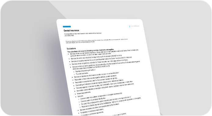 Metropolitan Life Insurance Company | 200 Park Avenue | New York, NY 10166 L0325047071[exp0327][xNM] © 2025 MetLife Services and Solutions, LLC DN-ANY-PPO-DUAL PLAN SUMMARY Dental Insurance Coverage that can help make it easier to visit a dentist and can help lower your dental costs. The service categories and plan limitations shown above represent an overview of your plan benefits. This document presents the majority of services within each category, but is not a complete description of the plan. Exclusions This plan does not cover the following services, treatments and supplies: • Services which are not Dentally Necessary, those which do not meet generally accepted standards of care for treating the particular dental condition, or which we deem experimental in nature; • Services for which you would not be required to pay in the absence of Dental Insurance; • Services or supplies received by you or your Dependent before the Dental Insurance starts for that person; • Services which are primarily cosmetic (for Texas residents, see notice page section in Certificate); • Services which are neither performed nor prescribed by a Dentist except for those services of a licensed dental hygienist which are supervised and billed by a Dentist and which are for: o Scaling and polishing of teeth; or o Fluoride treatments; • Services or appliances which restore or alter occlusion or vertical dimension; • Restoration of tooth structure damaged by attrition, abrasion or erosion; • Restorations or appliances used for the purpose of periodontal splinting; • Counseling or instruction about oral hygiene, plaque control, nutrition and tobacco; • Personal supplies or devices including, but not limited to: water picks, toothbrushes, or dental floss; • Decoration, personalization or inscription of any tooth, device, appliance, crown or other dental work; • Missed appointments; • Services: o Covered under any workers’ compensation or occupational disease law; o Covered under any employer liability law; o For which the employer of the person receiving such services is not required to pay; or o Received at a facility maintained by the Employer, labor union, mutual benefit association, or VA hospital; • Services covered under other coverage provided by the Employer; • Temporary or provisional restorations; • Temporary or provisional appliances; • Prescription drugs; • Services for which the submitted documentation indicates a poor prognosis; • The following when charged by the Dentist on a separate basis: o Claim form completion; o Infection control such as gloves, masks, and sterilization of supplies; or o Local anesthesia, non-intravenous conscious sedation or analgesia such as nitrous oxide. • Dental services arising out of accidental injury to the teeth and supporting structures, except for injuries to the teeth due to chewing or biting of food; • Caries susceptibility tests; • Initial installation of a fixed and permanent Denture to replace one or more natural teeth which were missing before such person was insured for Dental Insurance, except for congenitally missing natural teeth; • Other fixed Denture prosthetic services not described elsewhere in the certificate; • Precision attachments, except when the precision attachment is related to implant prosthetics; • Initial installation of a full or removable Denture to replace one or more natural teeth which were missing before such person was insured for Dental Insurance, except for congenitally missing natural teeth; • Addition of teeth to a partial removable Denture to replace one or more natural teeth which were missing before such person was insured for Dental Insurance, except for congenitally missing natural teeth; • Adjustment of a Denture made within 6 months after installation by the same Dentist who installed it;
