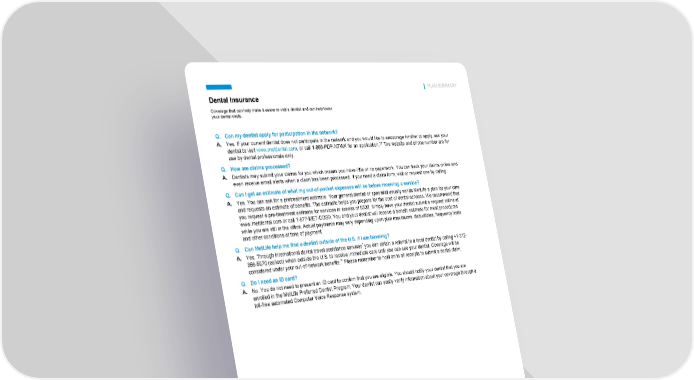 Metropolitan Life Insurance Company | 200 Park Avenue | New York, NY 10166 L0325047071[exp0327][xNM] © 2025 MetLife Services and Solutions, LLC DN-ANY-PPO-DUAL PLAN SUMMARY Dental Insurance Coverage that can help make it easier to visit a dentist and can help lower your dental costs. Q. Can my dentist apply for participation in the network? A. Yes. If your current dentist does not participate in the network and you would like to encourage him/her to apply, ask your dentist to visit www.metdental.com, or call 1-866-PDP-NTWK for an application.†† The website and phone number are for use by dental professionals only. Q. How are claims processed? A. Dentists may submit your claims for you which means you have little or no paperwork. You can track your claims online and even receive email alerts when a claim has been processed. If you need a claim form, visit or request one by calling Q. Can I get an estimate of what my out-of-pocket expenses will be before receiving a service? A. Yes. You can ask for a pretreatment estimate. Your general dentist or specialist usually sends MetLife a plan for your care and requests an estimate of benefits. The estimate helps you prepare for the cost of dental services. We recommend that you request a pre-treatment estimate for services in excess of $300. Simply have your dentist submit a request online at www.metdental.com or call 1-877-MET-DDS9. You and your dentist will receive a benefit estimate for most procedures while you are still in the office. Actual payments may vary depending upon plan maximums, deductibles, frequency limits and other conditions at time of payment. Q. Can MetLife help me find a dentist outside of the U.S. if I am traveling? A. Yes. Through international dental travel assistance services* you can obtain a referral to a local dentist by calling +1-312- 356-5970 (collect) when outside the U.S. to receive immediate care until you can see your dentist. Coverage will be considered under your out-of-network benefits.** Please remember to hold on to all receipts to submit a dental claim. Q. Do I need an ID card? A. No. You do not need to present an ID card to confirm that you are eligible. You should notify your dentist that you are enrolled in the MetLife Preferred Dentist Program. Your dentist can easily verify information about your coverage through a toll-free automated Computer Voice Response system.