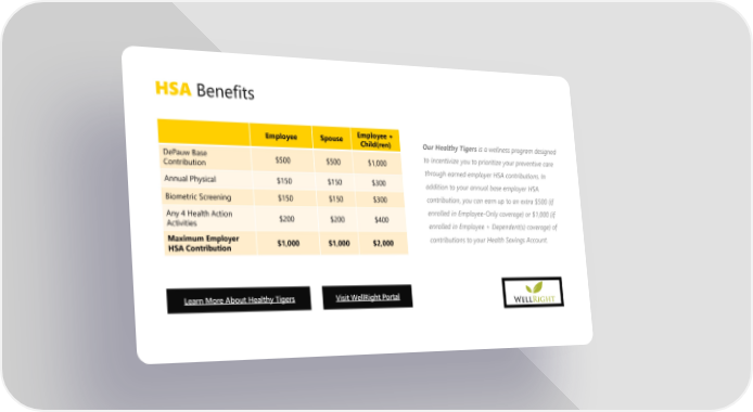 HSA Benefits Employee Spouse Employee + Child(ren) Our Healthy Tigers is a wellness program designed DePauw Base $500 $500 $1,000 to incentivize you to prioritize your preventive care Contribution through earned employer HSA contributions. In Annual Physical $150 $150 $300 addition to your annual base employer HSA Biometric Screening $150 $150 $300 contribution, you can earn up to an extra $500 (if Any 4 Health Action $200 $200 $400 enrolled in Employee-Only coverage) or $1,000 (if Activities enrolled in Employee + Dependent(s) coverage) of Maximum Employer $1,000 $1,000 $2,000 contributions to your Health Savings Account. HSA Contribution Learn More About Healthy Tigers Visit WellRight Portal