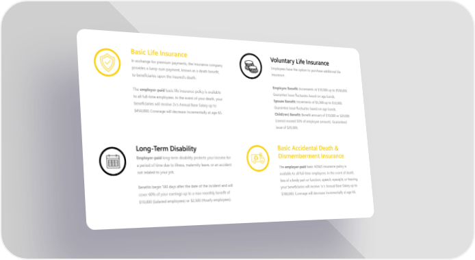 Basic Life Insurance Voluntary Life Insurance In exchange for premium payments, the insurance company Employees have the option to purchase additional life provides a lump-sum payment, known as a death benefit, insurance. to beneficiaries upon the insured's death. Employee Benefit: Increments of $10,000 up to $500,000. The employer-paid basic life insurance policy is available Guarantee issue fluctuates based on age bands. to all full-time employees. In the event of your death, your Spouse Benefit: Increments of $5,000 up to $50,000. beneficiaries will receive 2x's Annual Base Salary up to Guarantee issue fluctuates based on age bands. $450,000. Coverage will decrease incrementally at age 65. Child(ren) Benefit: Benefit amount of $10,000 or $20,000 (cannot exceed 50% of employee amount). Guaranteed issue of $20,000. Long-Term Disability Basic Accidental Death & Employer-paid long-term disability protects your income for Dismemberment Insurance a period of time due to illness, maternity leave, or an accident The employer-paid basic AD&D insurance policy is not related to your job. available to all full-time employees. In the event of death, Benefits begin 180 days after the date of the incident and will loss of a body part or function, speech, eyesight, or hearing, cover 60% of your earnings up to a max monthly benefit of your beneficiaries will receive 1x's Annual Base Salary up to $10,000 (Salaried employees) or $2,500 (Hourly employees). $180,000. Coverage will decrease incrementally at age 65.