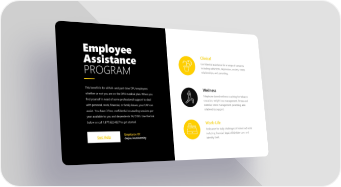 Employee Clinical Assistance Confidential assistance for a range of concerns including addictions, depression, anxiety, stress, PROGRAM relationships, and parenting. This benefit is for all full- and part-time DPU employees Wellness whether or not you are on the DPU medical plan. When you Telephone based wellness coaching for tobacco find yourself in need of some professional support to deal cessation, weight loss management, fitness and with personal, work, financial, or family issues, your EAP can exercise, stress management, parenting, and assist. You have 3 free, confidential counseling sessions per relationship support. year available to you and dependents 24/7/365. Use the link below or call 1.877.622.4327 to get started. Work-Life Assistance for daily challenges at home and work Get Help Employee ID: including financial, legal, child/elder care, and depauwuniversity identity theft.