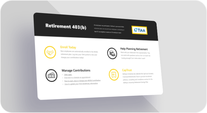 All employees may participate in DePauw's sponsored 403(b) Retirement 403(b) retirement plan, but only full-time employees contributing at least 5% are eligible to receive an 8% employer match. Enroll Today Help Planning Retirement New employees are automatically enrolled in the 403(b) Meet with your dedicated TIAA representative. They retirement plan. Log into your TIAA portal to view and can assist with questions such as: Am I on track? Am change your contributions today! I saving enough? Can I retire when I want? Manage Contributions CapTrust • TIAA Login DePauw University has selected the CapTrust (formerly • Click here to schedule an appointment Cammack Retirement) Team to provide investment • How to start, stop or change your 403(b) Contribution advisory, consulting and compliance services for the • How to update your TIAA beneficiary information DePauw University Retirement Savings Plan.