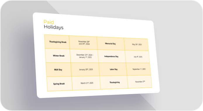 Paid Holidays November 28th th Thanksgiving Break th, 2024 Memorial Day May 26 , 2025 and 29 December 23rd, 2024 – th Winter Break st Independence Day July 4 , 2025 January 1 , 2025 th st MLK Day January 20 , 2025 Labor Day September 1 , 2025 st th Spring Break March 21 , 2025 Thanksgiving November 27
